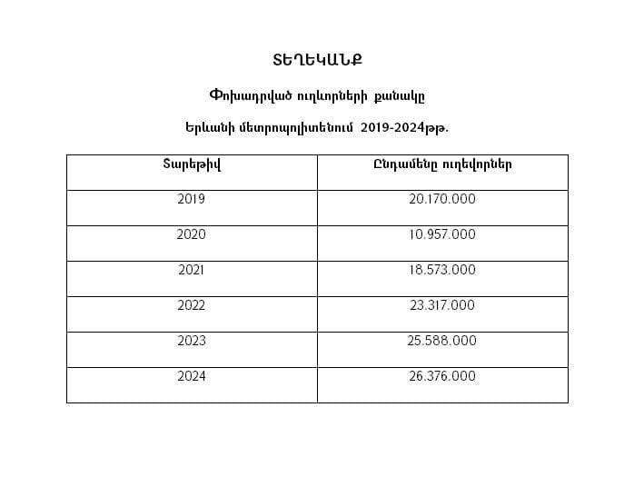 Եվ այսպես, լուսանկարում պատկերված տեղեկանքը Երևանի մետրոպոլիտենի տարեկան ուղևորափոխադրումների թիվն է։ Ինչպես տեսնում եք, 2019 թվականին մետրոյի տարեկան ուղևորափոխադրումների թիվը կազմել է շուրջ 20,170,000։ 2020 թվականին, COVID-19-ի պատճառով, հասկանալիորեն նվազել է, բայց արդեն 2021 թվականին, զարմանալիորեն, 2019 թվականի համեմատ կրկին նվազել է՝ կազմելով շուրջ 18,573,000։