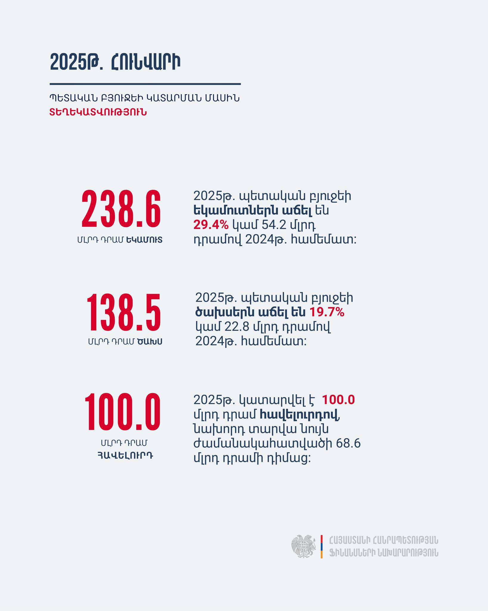 2025 թվականի հունվար ամսվա ընթացքում ՀՀ պետական բյուջեն կատարվել է 100 մլրդ դրամ հավելուրդով՝ նախորդ տարվա նույն ժամանակահատվածի 68.6 մլրդ դրամի դիմաց: