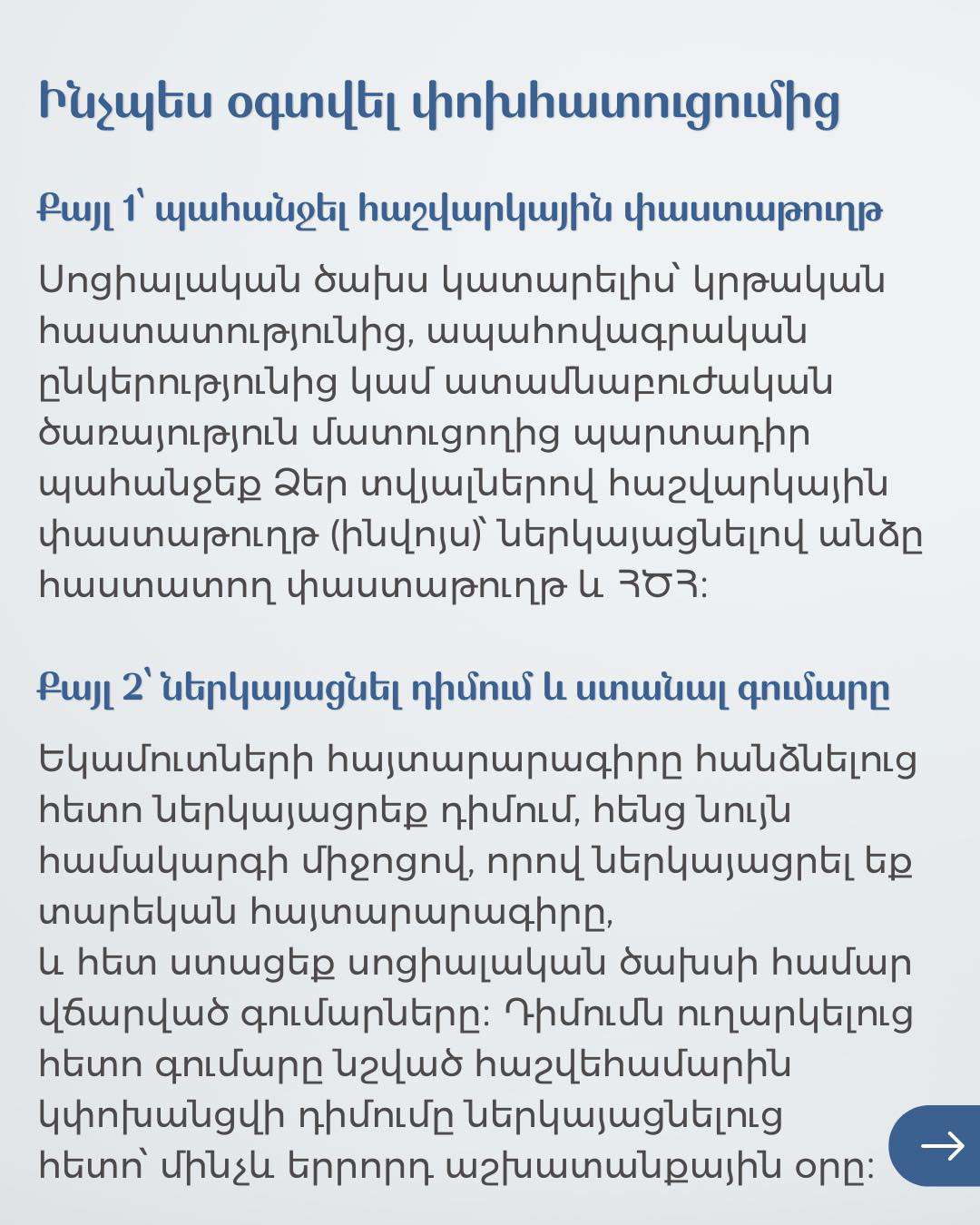 Հայաստանի Հանրապետության ռեզիդենտ Հայաստանի Հանրապետության քաղաքացիները եկամուտների տարեկան հայտարարագիր ներկայացնելու և եկամտային հարկ ունենալու դեպքում հաշվետու տարվա ընթացքում առողջապահության և/կամ կրթության գծով իրենց կողմից կատարված սոցիալական ծախսերի դիմաց կարող են օգտվել փոխհատուցման հնարավորությունից: Հաջորդիվ հարցուպատասխան ձևաչափով ներկայացվում է աջակցության ծրագրի ընթացակարգը և քայլերի հաջորդականությունը։