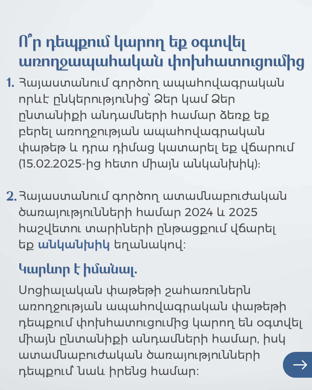 - Հայաստանում գործող ապահովագրական որևէ ընկերությունից՝ Ձեր կամ Ձեր ընտանիքի անդամների համար ձեռք եք բերել առողջության ապահովագրական փաթեթ և դրա դիմաց կատարել եք վճարում։ Հիշեք, որ ապահովագրական փաթեթի ձեռքբերման ծախսի փոխհատուցման նպատակով՝ 2025 թվականի փետրվարի 15-ից հետո վճարումները պետք է կատարվեն անկանխիկ եղանակով։