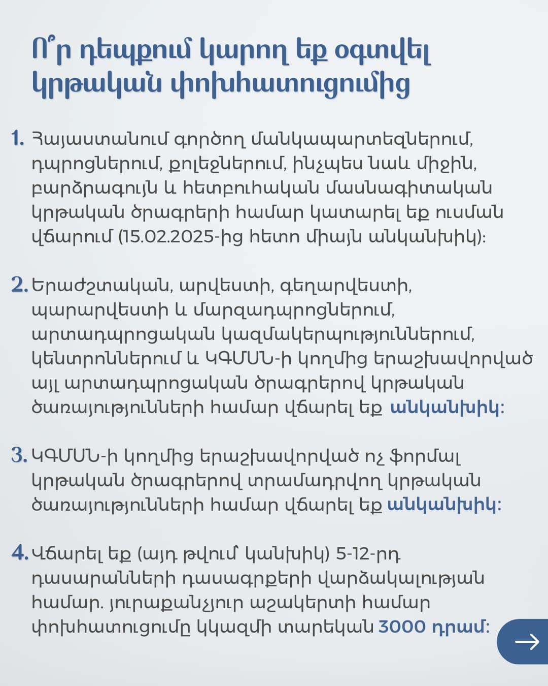 - Հայաստանում գործող նախադպրոցական, տարրական, հիմնական, միջնակարգ, նախնական մասնագիտական (արհեստագործական) հաստատություններում, ինչպես նաև միջին, բարձրագույն և հետբուհական մասնագիտական կրթական ծրագրերի համար կատարել եք ուսման վճարում։ Հիշեք, որ ուսման վճարի փոխհատուցման նպատակով՝ 2025 թվականի փետրվարի 15-ից հետո վճարումները պետք է կատարվեն անկանխիկ եղանակով։