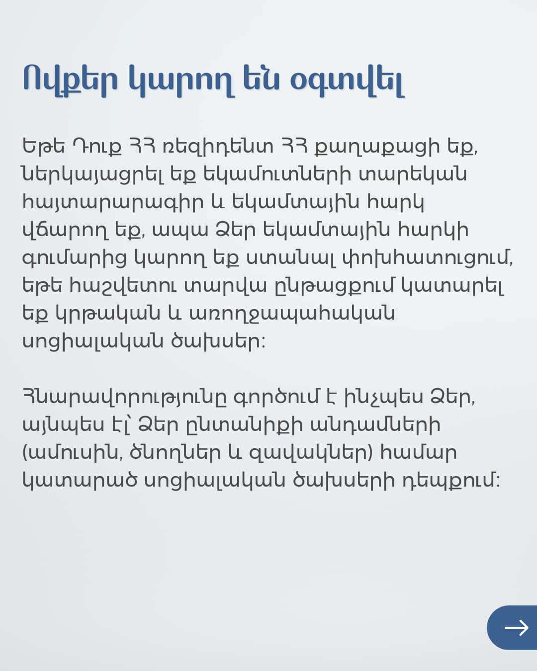 Փոխհատուցումից կարող եք օգտվել, եթե հաշվետու տարվա ընթացքում կրթության և/կամ առողջապահության գծով կատարել եք սոցիալական ծախսեր։
