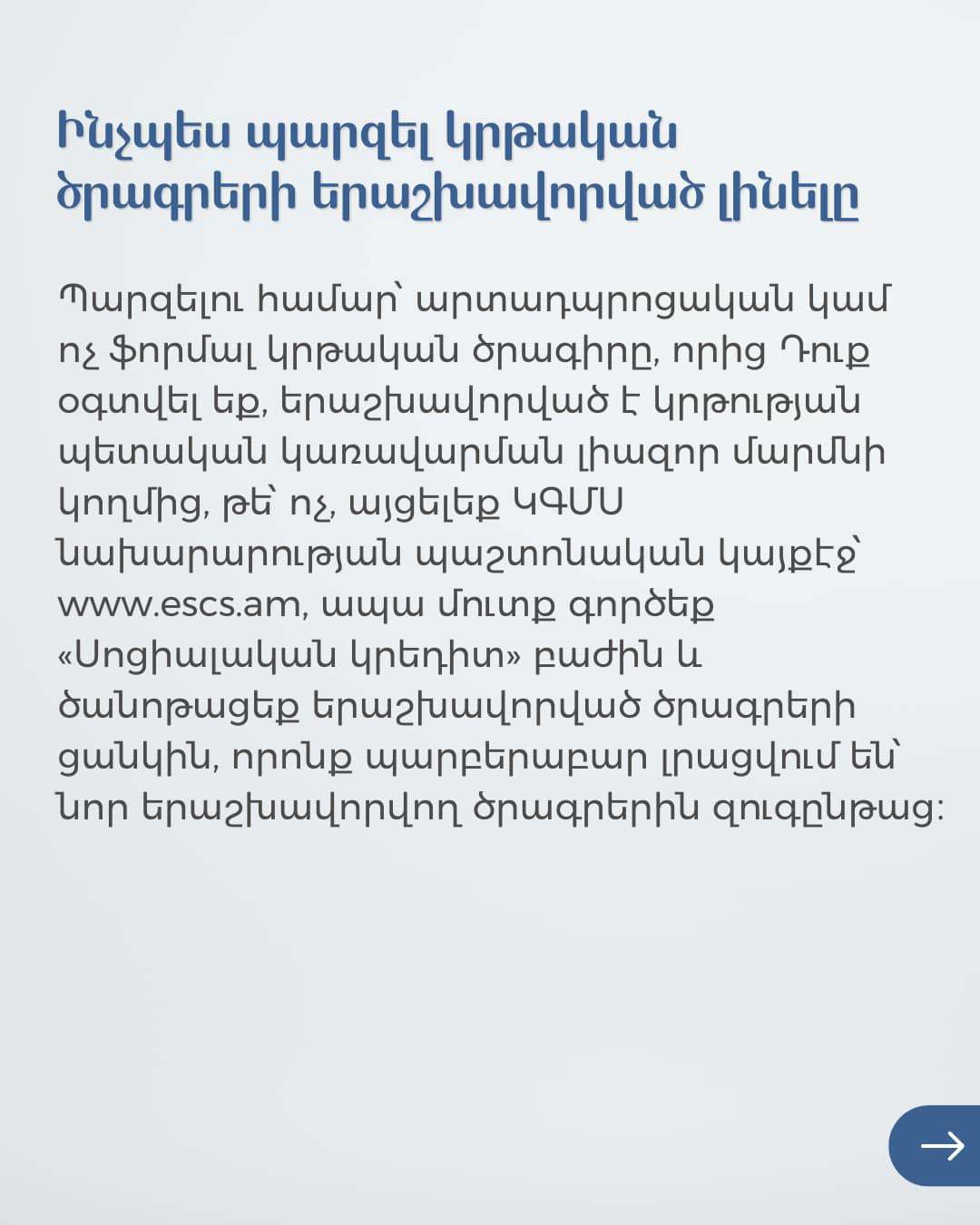 Պարզելու համար՝ արդյոք արտադպրոցական կամ ոչ ֆորմալ կրթական ծրագիրը, որից Դուք օգտվել եք, երաշխավորված է կրթության պետական կառավարման լիազոր մարմնի կողմից, թե՝ ոչ, այցելեք ԿԳՄՍՆ www.escs.am պաշտոնական կայքէջ, ապա մուտք գործեք «Սոցիալական կրեդիտ» բաժին և ծանոթացեք երաշխավորված ծրագրերի ցանկին, որոնք պարբերաբար լրացվում են՝ նոր երաշխավորվող ծրագրերին զուգընթաց։