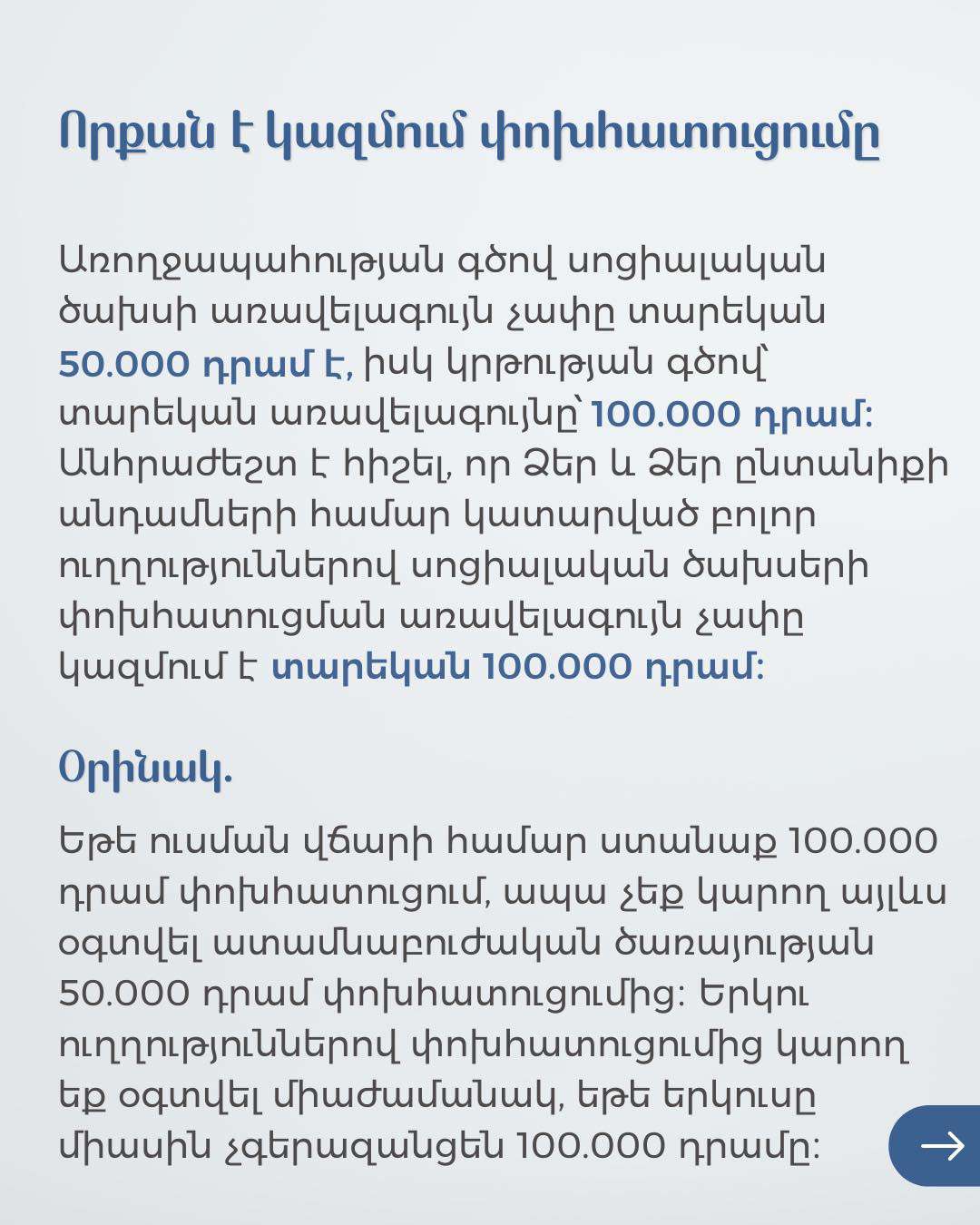 Անհրաժեշտ է հիշել, որ Ձեր և Ձեր ընտանիքի անդամների համար կատարված բոլոր ուղղություններով սոցիալական ծախսերի փոխհատուցման առավելագույնը չափը կազմում է տարեկան 100․000 դրամ: