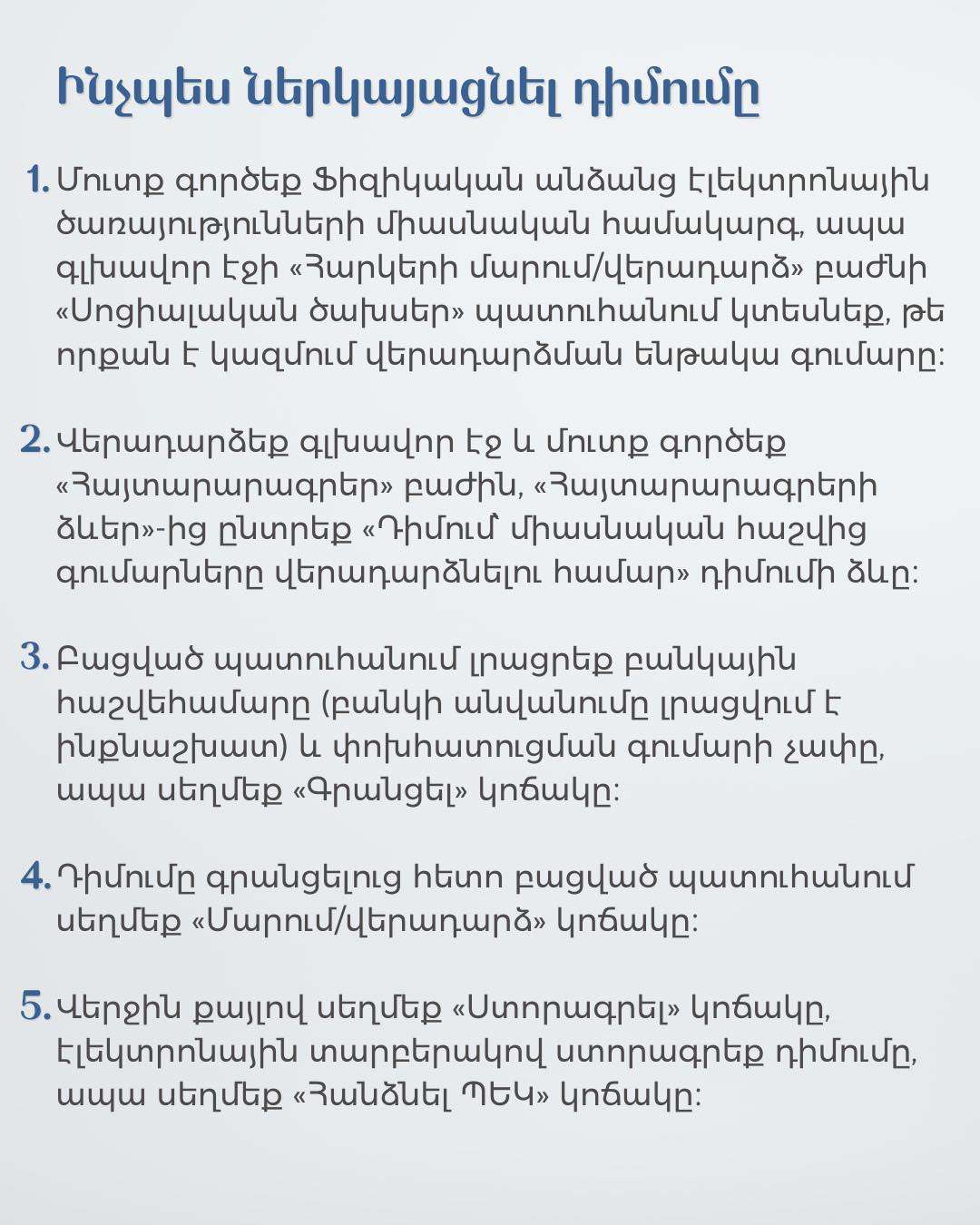 Եկամուտների տարեկան հայտարարագիրը ներկայացնելուց հետո, հենց նույն համակարգի միջոցով, որով ներկայացրել եք տարեկան հայտարարագիրը, կարող եք դիմել և հետ ստանալ սոցիալական ծախսի համար վճարված գումարները՝ հետևյալ քայլերի հաջորդականությամբ․