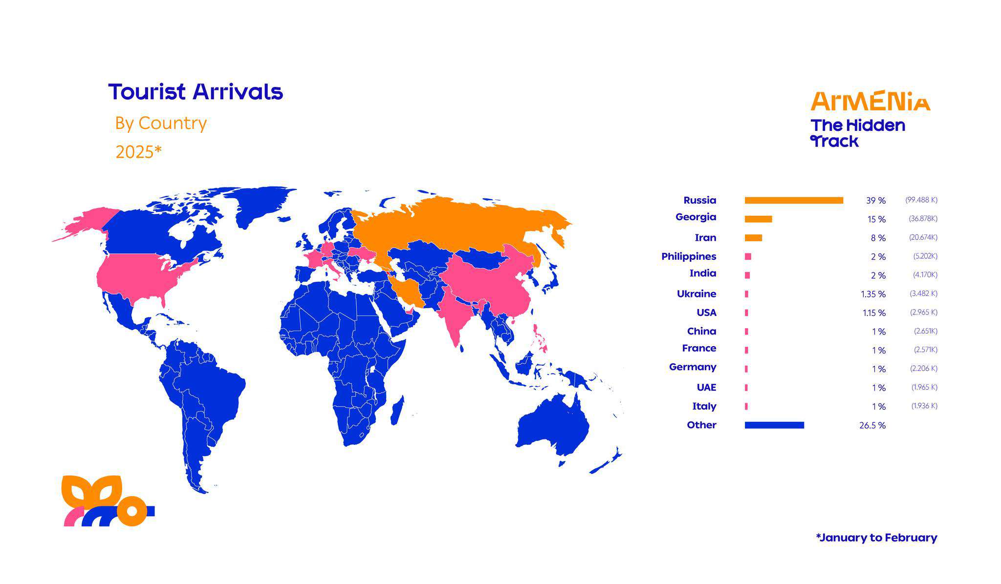 2025 թ․ փետրվար ամսին դեպի Հայաստան առավել շատ զբոսաշրջային այցելություններ գրանցվել են Ռուսաստանից (39 %), Վրաստանից (15%) և Իրանից (8%)»: