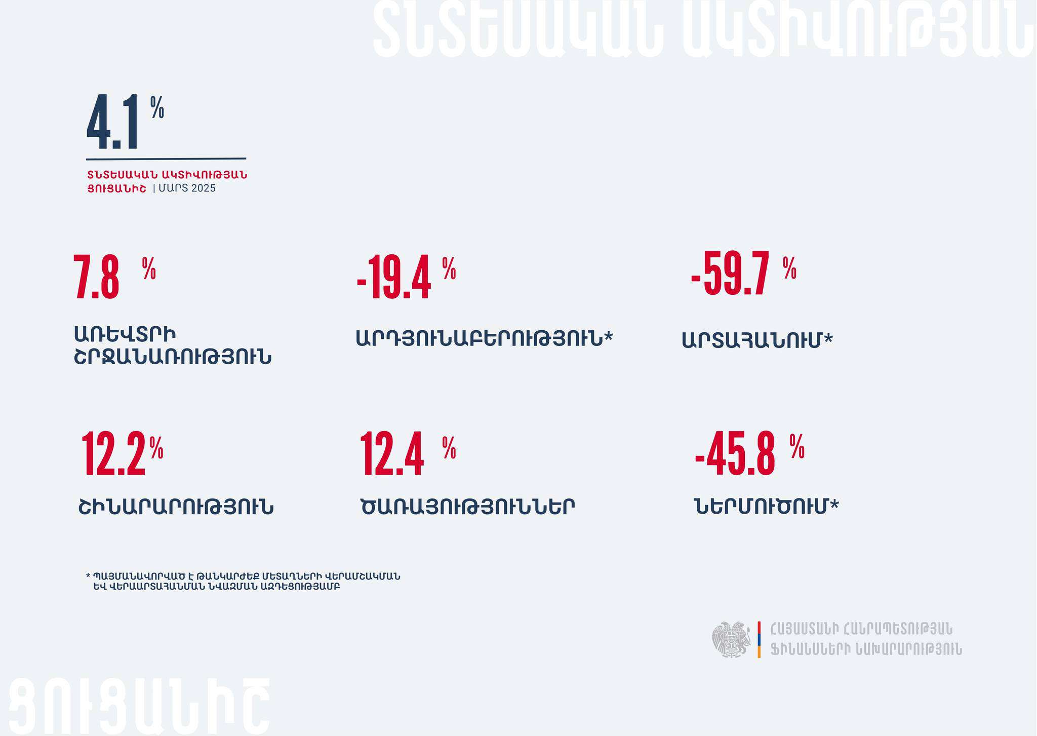 Արդյունաբերական արտադրանքի ծավալները նախորդ տարվա նույն ամիսների համեմատ նվազել են 19.4%-ով, մինչդեռ շինարարության ծավալներն աճել են 22.2%-ով: