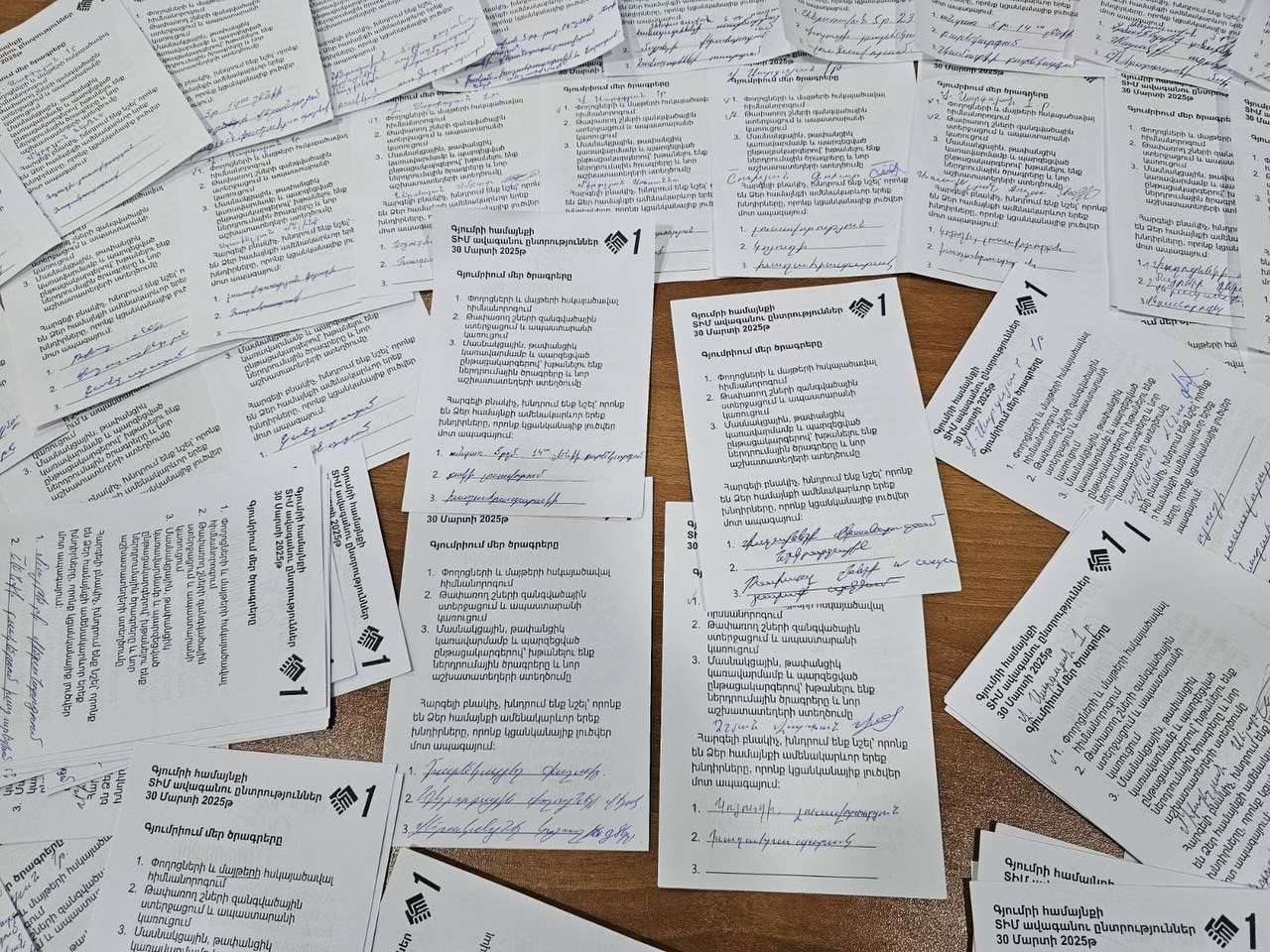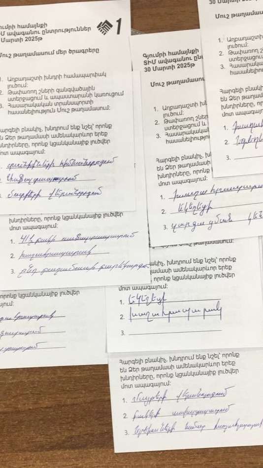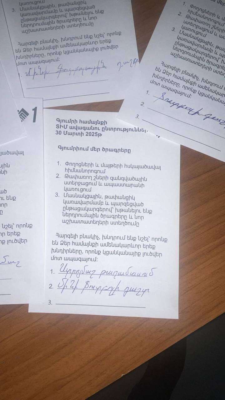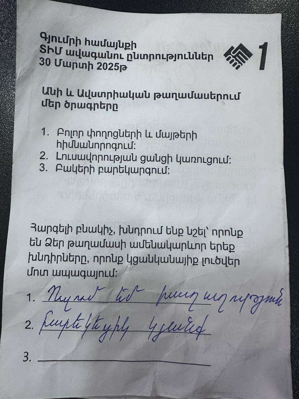 «Սիրելի՛ գյումրեցիներ, վերջին օրերին մեր նախընտրական շտաբների անդամները ձեզ են բաժանել այս հարցաթերթիկները, որոնք լրացնելով դուք առաջարկություն-պահանջ եք ներկայացրել մեզ՝ ակնկալելով տարաբնույթ խնդիրների շուտափույթ լուծում։