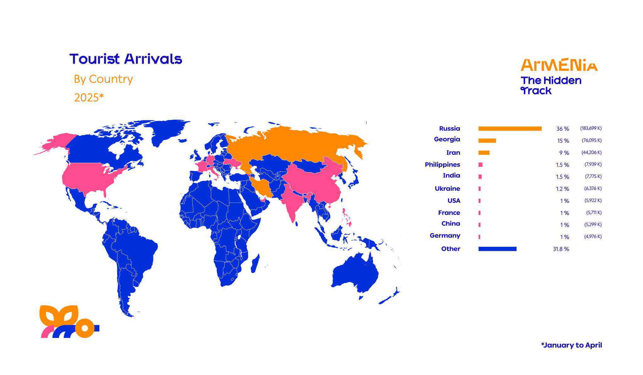 2025 թ․ ապրիլ ամսին դեպի Հայաստան առավել շատ զբոսաշրջային այցելություններ գրանցվել են Ռուսաստանից (36%), Վրաստանից (15%) և Իրանից (9%):