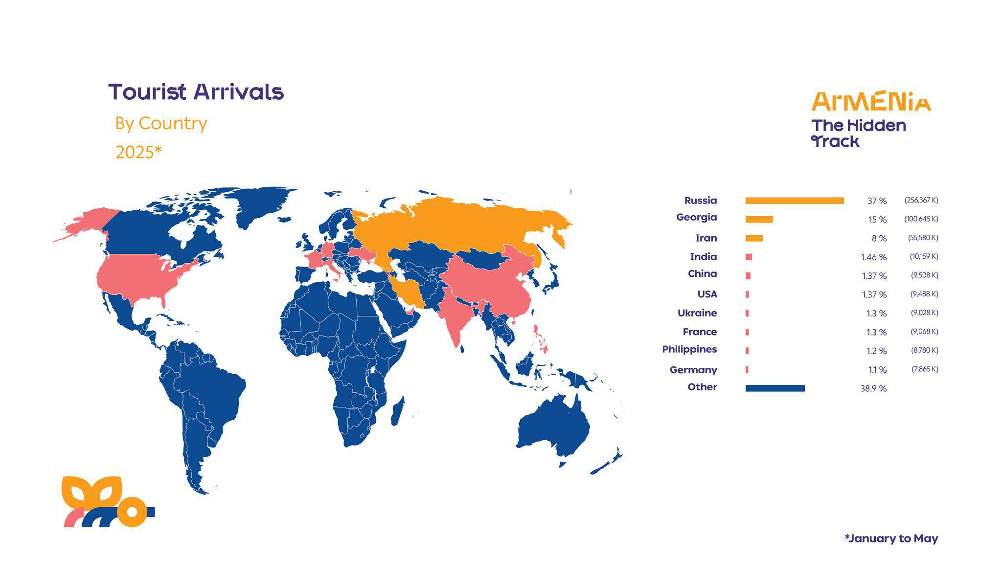 2025 թ․ հունվար-մայիս ամսին դեպի Հայաստան առավել շատ զբոսաշրջային այցելություններ գրանցվել են Ռուսաստանից (37%), Վրաստանից (15%) և Իրանից (8%):