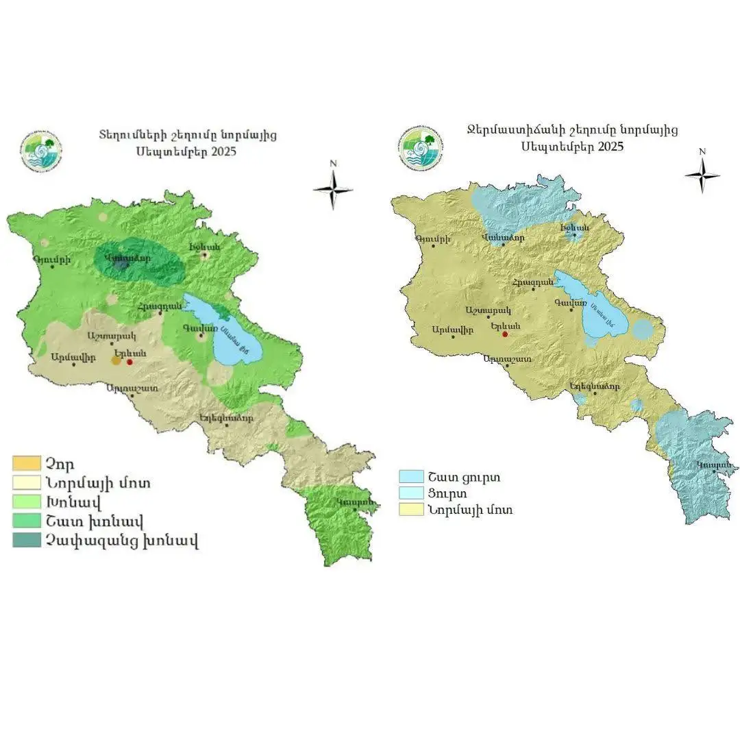 «2025 թվականի սեպտեմբեր ամսվա միջին ամսական ջերմաստիճանը Հայաստանում կազմել է 13․1°C, որը նորմայից ցածր էր 0․8°C-ով։ Տեղումների ամսական քանակը՝ 44․3մմ, նորմայից բարձր էր՝ կազմելով նորմայի 140%-ը։