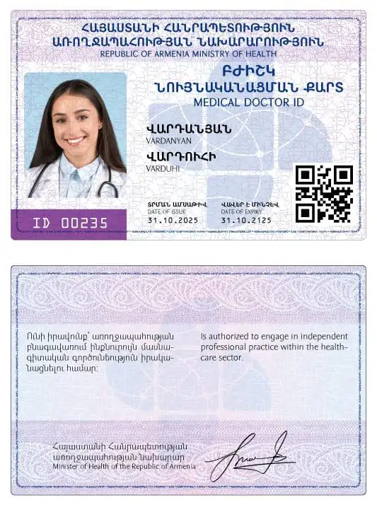 Բուժաշխատողների ռեգիստրի ներդմամբ նման ID քարտեր ենք նախատեսել ձեզ համար: Այն թե´ՀՀ-ում, և թե´ այլ երկրներում կփաստի ձեր բժիշկ լինելը: