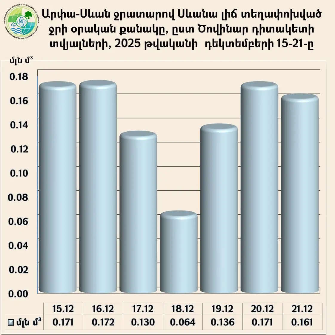 Արփա-Սևան ջրատարով Սևանա լիճ տեղափոխված ջրի քանակը 2025 թվականի դեկտեմբերի 15-21-ն ընկած ժամանակահատվածում կազմել է 1.005 մլն.մ³, իսկ 2025 թվականի հունվարի 1-ից դեկտեմբերի 21-ը ներառյալ՝ 118.598 մլն.մ³»։