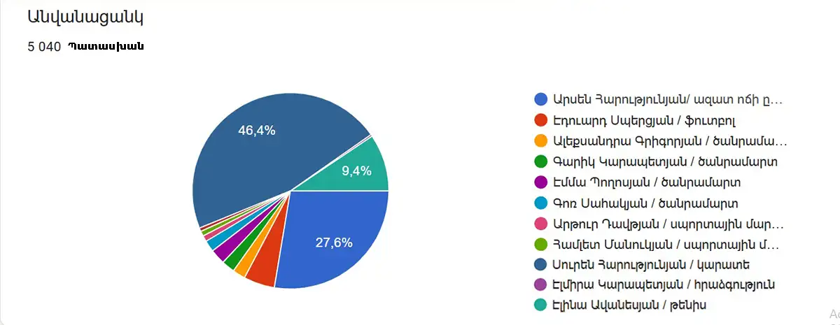 Սուրեն Հարությունյանը ստացել է 2341 ձայն՝ 46,4 տոկոս: Երկրորդ տեղը զբաղեցրել է Արսեն Հարությունյանը՝ 1392 ձայն՝ 27,6 տոկոս, իսկ լավագույն եռյակը եզրափակել է Էլինա Ավանեսյանը՝ 475 ձայն՝ 9,4 տոկոս: