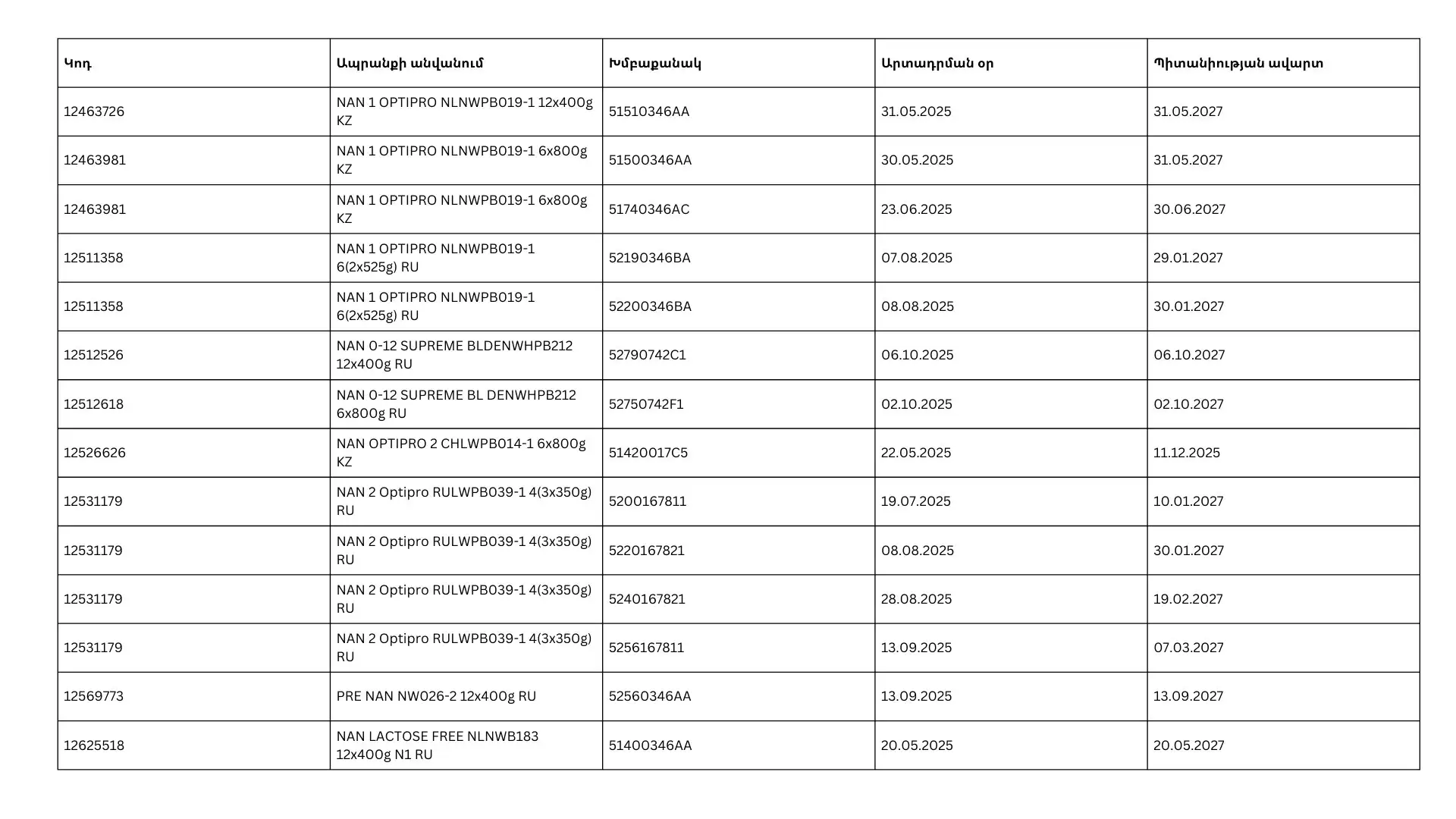 Եթե իրացման ցանցում կտեսնեք տուփեր NAN ապրանքանիշի նշված խմբաքանակներից՝ հորդորում ենք չգնել դրանք և անմիջապես տեղեկացնել Տեսչական մարմնի թեժ գծի հեռախոսահամարով՝ 118. այն շուրջօրյա է և անվճար: