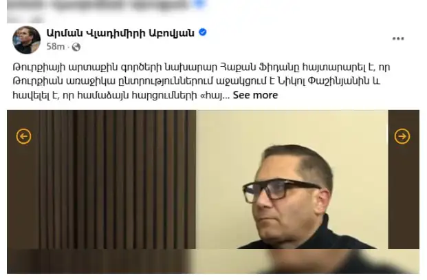 «Թուրքիայի արտաքին գործերի նախարար Հաքան Ֆիդանը հայտարարել է, որ Թուրքիան առաջիկա ընտրություններում աջակցում է Նիկոլ Փաշինյանին․․․», -գրում է «ՍպուտնիկԱրմենիա»-ի մեկնաբան Արման Աբովյանը։