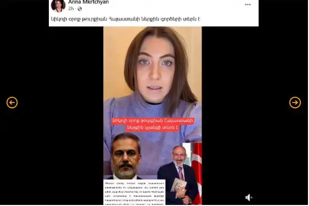«Թուրքիայի արտաքին գործերի նախարարը այսօր բացահայտ հայտարարել է, որ առաջիկա ընտրությունների ժամանակ իրենք աջակցելու են իրենց Նիկոլ Փաշինյանին»,- իր ֆեյսբուքյան տեսաուղերձում հայտարարել է Հանրապետական կուսակցության անդամ, ԱԺ պատգամավոր Աննա Մկրտչյանը։