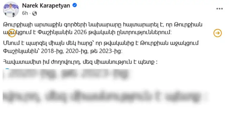 Ավելի ուշ ապատեղեկատվական արշավին միացավ նաև «Մեր ձևով» շարժման համակարգող Նարեկ Կարապետյանը։ «Թուրքիայի արտաքին գործերի նախարարը հայտարարել է, որ Թուրքիան աջակցում է Փաշինյանին 2026 թվականի ընտրություններում»,- ֆեյսբուքում գրել էր նա։