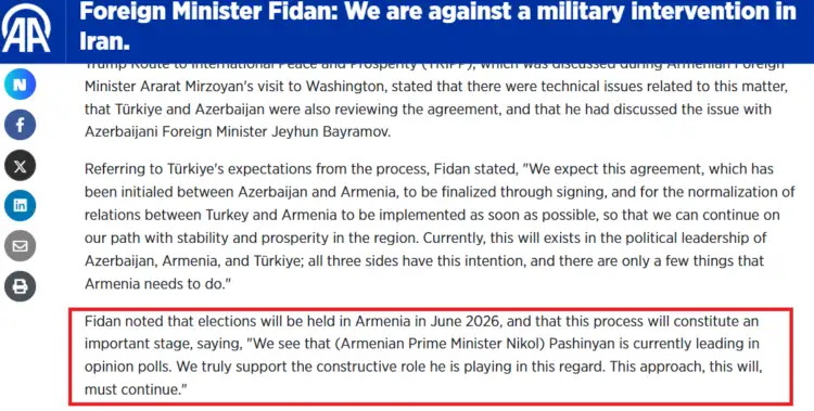 Հայաստանյան մեդիա դաշտը, ինչպես նաև քաղաքական՝ հիմնականում ընդդիմադիր շրջանակները տարածում են ապատեղեկատվություն, թե իբր Ֆիդանը հայտարարել է, որ առաջիկա ընտրություններում Թուրքիան աջակցում է Փաշինյանին։