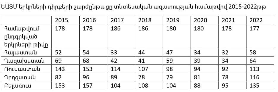Սույն տեղեկանքում փորձել ենք ուսումնասիրել՝ ինչպիսին է իրավիճակը Հայաստանում և ԵԱՏՄ երկրներում։ ԵԱՏՄ երկրներից միայն Հայաստանը և Ղազախստանն են գտնվում չափավոր ազատ երկրների խմբում։ Տես նաև նկար 1