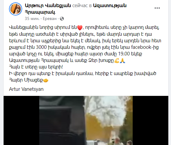 «Վանեցյանին նորից սիրում են, որովհետև սերը չի կարող մարել, եթե մարդը արժանի է սիրված լինելու։ Եթե մարդն արդար է, դա երևում է նրա աչքերից։ Նա եկել է մենակ, իսկ երեկ արդեն նրա հետ քայլում էին 3000 իսկական հայեր, ովքեր լսել էին նրա՝ facebook-ից արված կոչը ու եկել։
