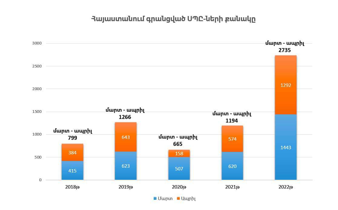 Ըստ վիճակագրական կոմիտեի տվյալների, 2022 թվականի մարտ-ապրիլ ամիսների ընթացքում Հայաստանում գրանցվել է 2735 ՍՊԸ, որից 1443-ը մարտին, 1292-ը՝ ապրիլին: