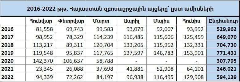 «Նախնական տվյալներով 2022թ. հունիս ամսին Հայաստան է այցելել 129,908 զբոսաշրջիկ, որից մոտ 57,000֊ը` ՌԴ֊ից։ Առաջին կիսամյակում ունենք 594,139 զբոսաշրջիկ»։