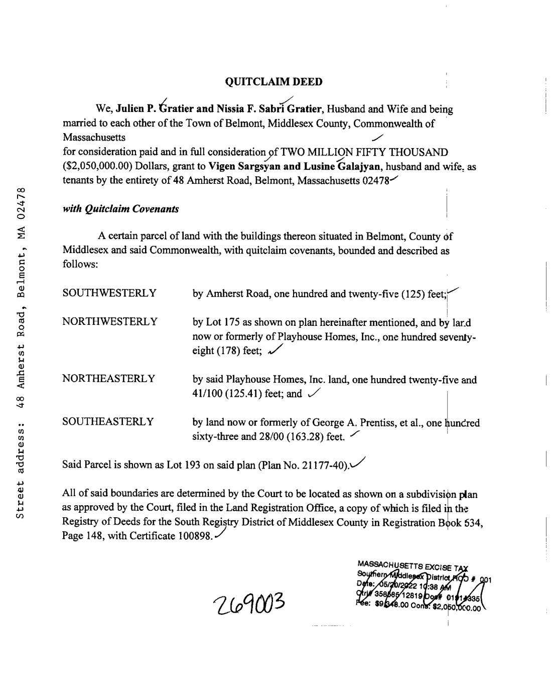«Սույն փաստաթուղթը հաստատում է, որ ՀՀ պաշտպանության նախկին նախարար Վիգեն Սարգսյանը, ով դրանից առաջ կարևորագույն պաշոտններ է զբաղեցրել Հայաստանի պաշտպանական գերատեսչությունում, նախագահի աշխատակազմում, ապա 2018-ին ՀՀԿ-ի կողմից առաջադրվել էր որպես վարչապետի թեկնածու, այս տարի մայիս ամսին ԱՄՆ-ի Մասաչուսեթս նահանգի Բելմոնտ քաղաքում ձեռք են բերել առանձնատուն 2,050,000,00 դոլարով։