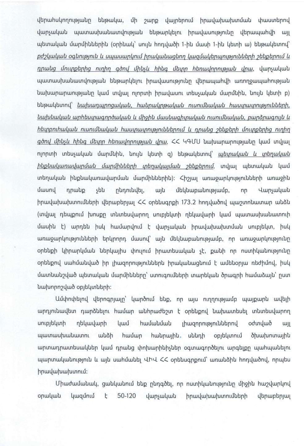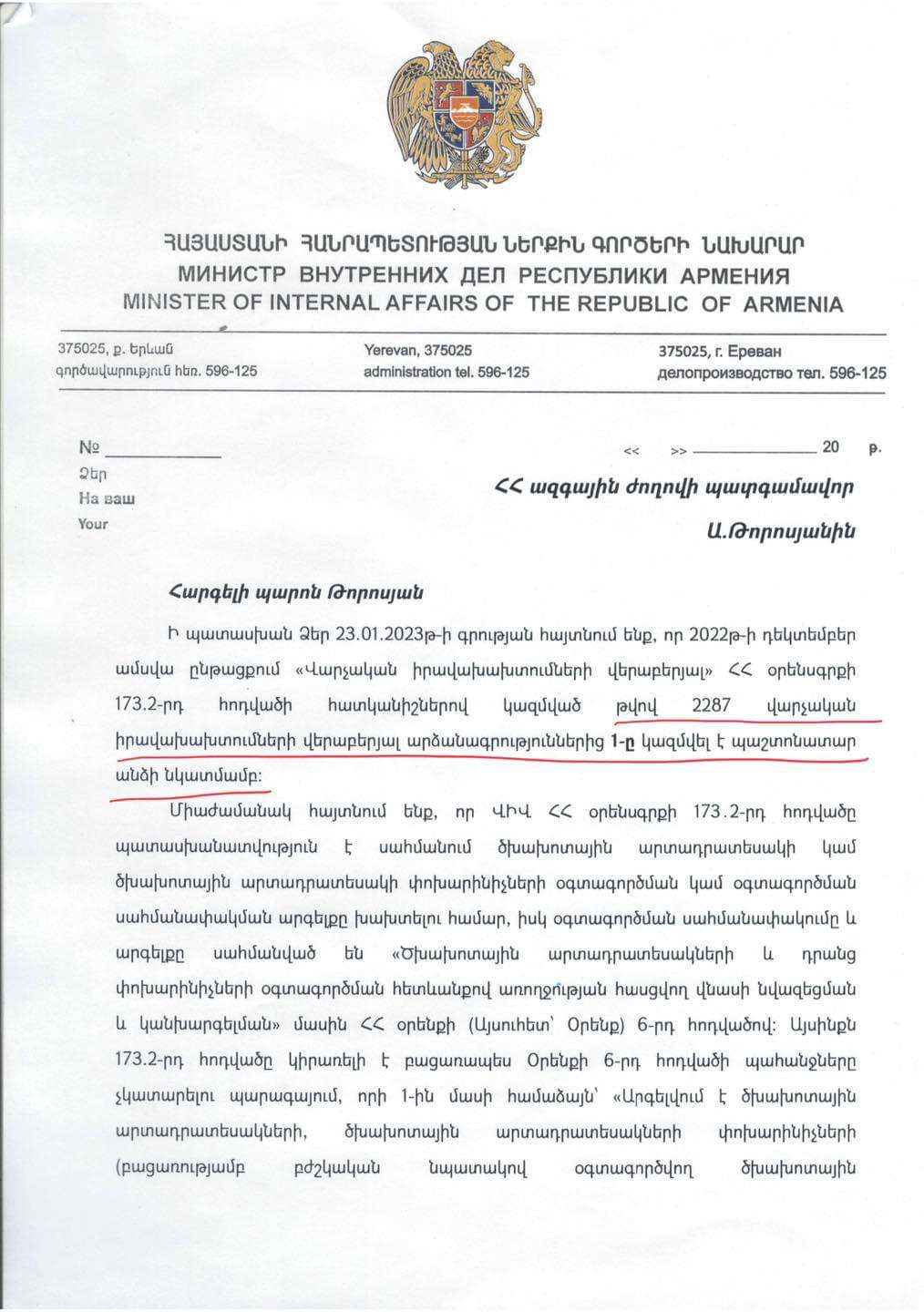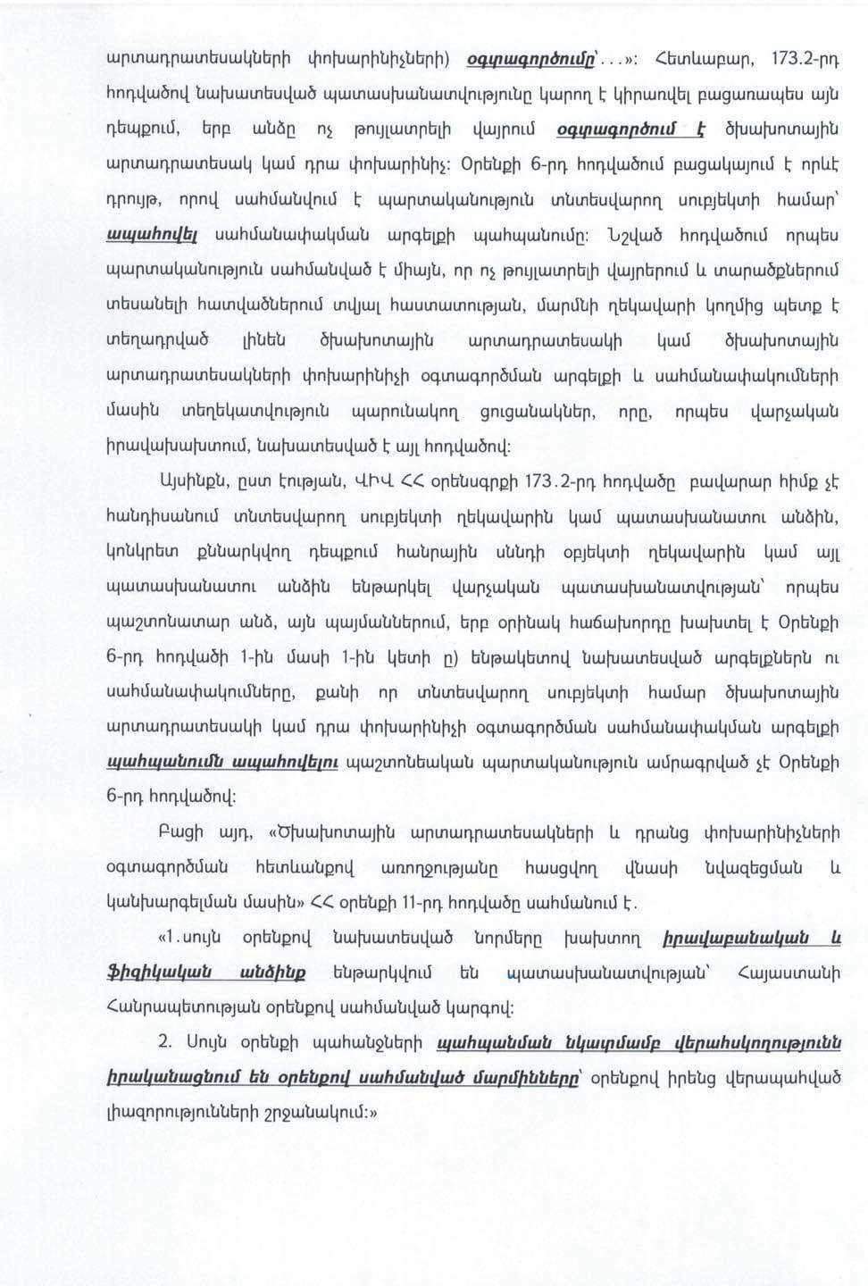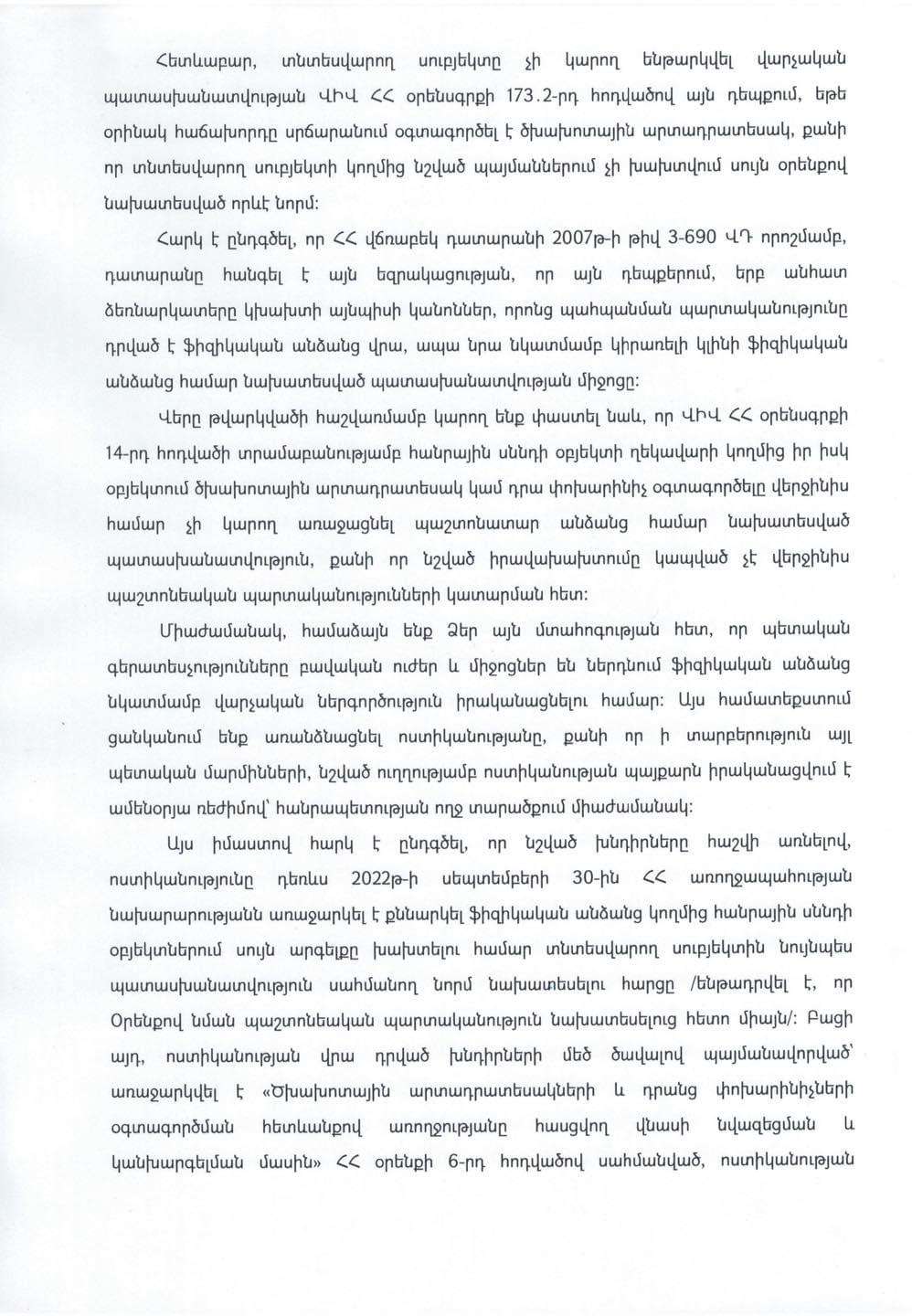 Հաշվի առնելով նշված խնդիրների բարձրաձայնումը ՆԳՆ կողմից, նախաձեռնելու եմ օրենսդրական փոփոխություններ, որպեսզի ոստիկանությունը կարողանա շատ հստակ վարչական պատասխանատվության ենթարկել այն հանրային սննդի կամ այլ հաստատությունների պատասխանատուներին/կառավարիչներին, ովքեր չեն կասեցրել իրենց հաստատություններում ծխախոտի և այլ ծխախոտային արտադրատեսակների կիրառումը, այսինքն ըստ էության թույլատրել են դա: Մեր պետական գերատեսչությունների ուշադրությունը պետք է ավելի շատ լինի հենց պատասխանատուների վրա, քանի որ հենց նրանք են պարտավոր ապահովել օրենքի բոլոր դրույթների կիրառումը: