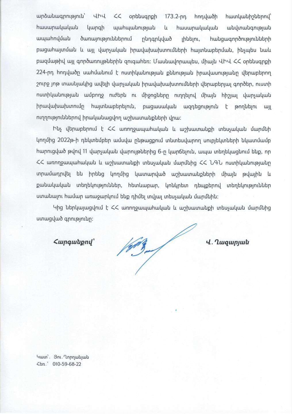 Հ.Գ. մեկ այլ խնդիր էլ կա օրենքի հետ կապված, դա արգելող նշանների բացակայությունն է, որը կրկին պարտավոր են հաստատությունների պատասխանատուներն ապահովել բոլորի համար տեսանելի վայրերում, բայց զանգվածաբար չեն անում դա, իսկ վարչական պատասխանատվության ենթարկելու մարմինն էլ Առողջապահական և աշխատանքի տեսչական մարմինն է: