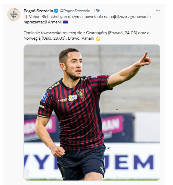 «Պոգոնի» կիսապաշտպան Վահան Բիչախչյանը հրավիրվել է Հայաստանի ազգային հավաքական, հայտնում է լեհական ակումբի մամուլի ծառայությունը։