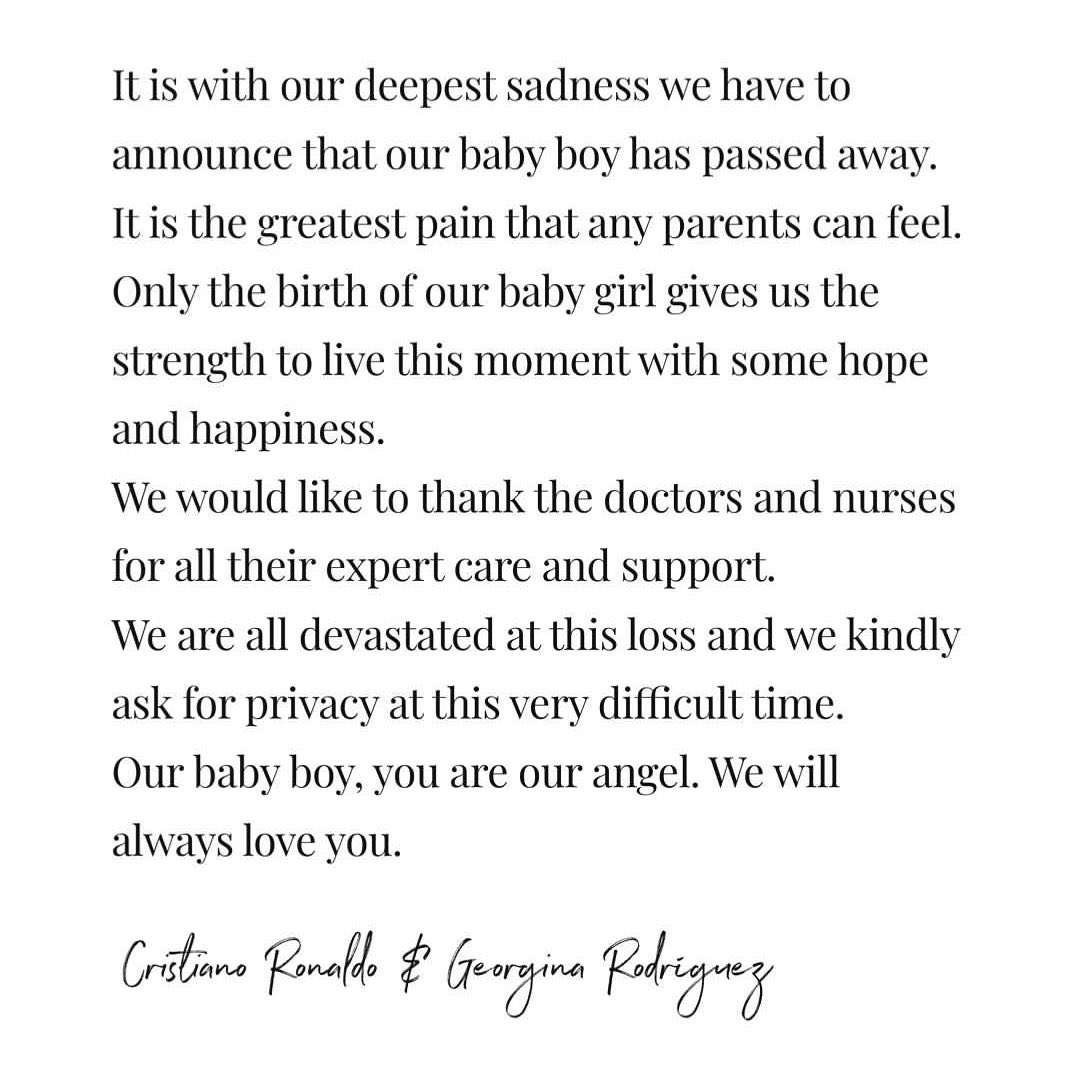 «Մեծ ցավով պետք է տեղեկացնեմ, որ մահացել է մեր նորածին տղան: Սա մեծ ցավ է, որ ցանկացած ծնող կարող էր զգալ: Միայն մեր աղջկա ծնունդն է ուժ տալիս, որ այս պահը հույսով հաղթահարենք: Ցանկանում ենք շնորհակություն հայտնել բժշկական անձնակազմին իրենց աշխատանքի համար: Մենք վշտացած ենք այս դեպքից և ուզում ենք սա մնա մեր անձնական տիրույթում: Մեր փոքրիկ տղա, մեր հրեշտակ, մենք քեզ միշտ կսիրենք»,- գրել է պորտուգալացին: