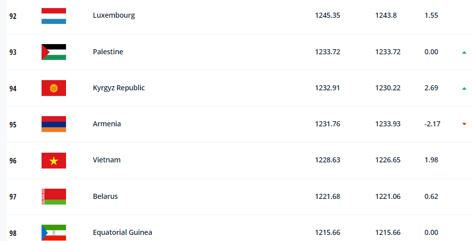 ՖԻՖԱ-ն այսօր հրապարակել է ազգային հավաքականների դասակարգման 2022 թ. վերջին վարկանիշային աղյուսակը: Հայաստանի ազգային ընտրանին հոկտեմբեր ամսվա համեմատ նահանջել է 2 հորիզոնական եւ հիմա 95-րդն է 1232 վարկանիշային միավորով: Նախորդ դասակարգման աղյուսակում (հոկտեմբերի 6) մեր հավաքականը զբաղեցնում էր 93-րդ հորիզոնականը։