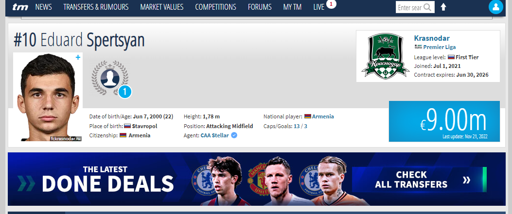 Transfermarkt կայքից տեղեկանում ենք, որ Հայաստանի հավաքականի և «Կրասնոդարի» կիսապաշտպան Էդուարդ Սպերցյանի ծառայություններով հետաքրքրված է Մադրիդի «Ռեալը»։ Տրանսֆերի հավանականությունը գնահատվում է 38 տոկոս: