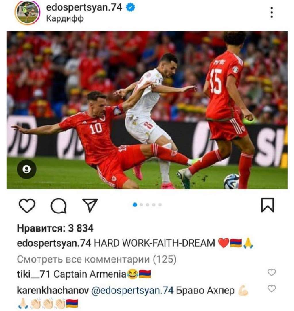 Ռուսաստանը ներկայացնող հայազգի թենիսիստ Կարեն Խաչանովը գրառում է կատարել Հայաստանի ֆուտբոլի ազգային հավաքականի կիսապաշտպան Էդուարդ Սպերցյանի Instagram-ի հրապարակման մեկնաբանություններում։
