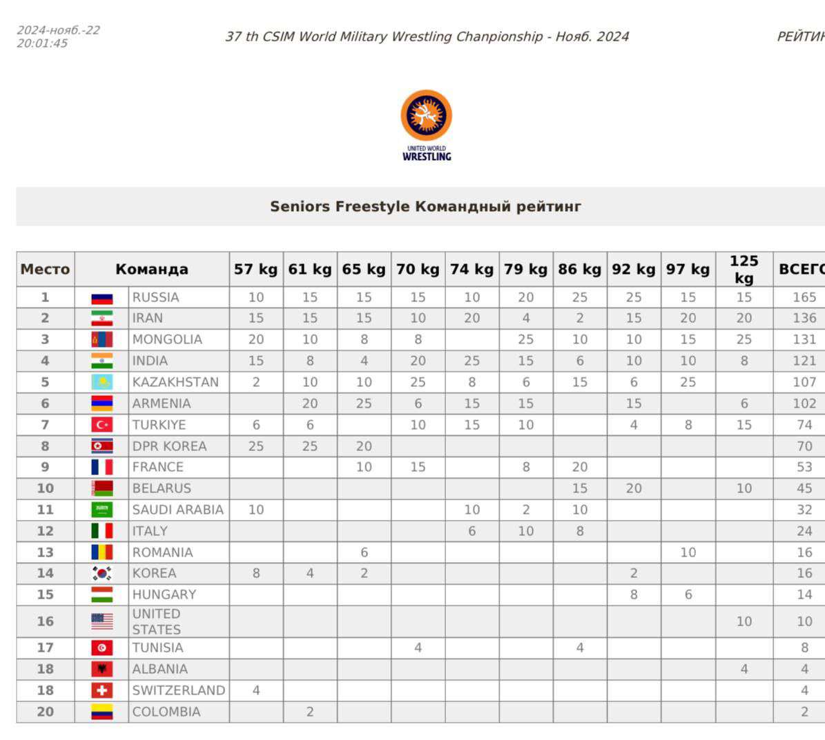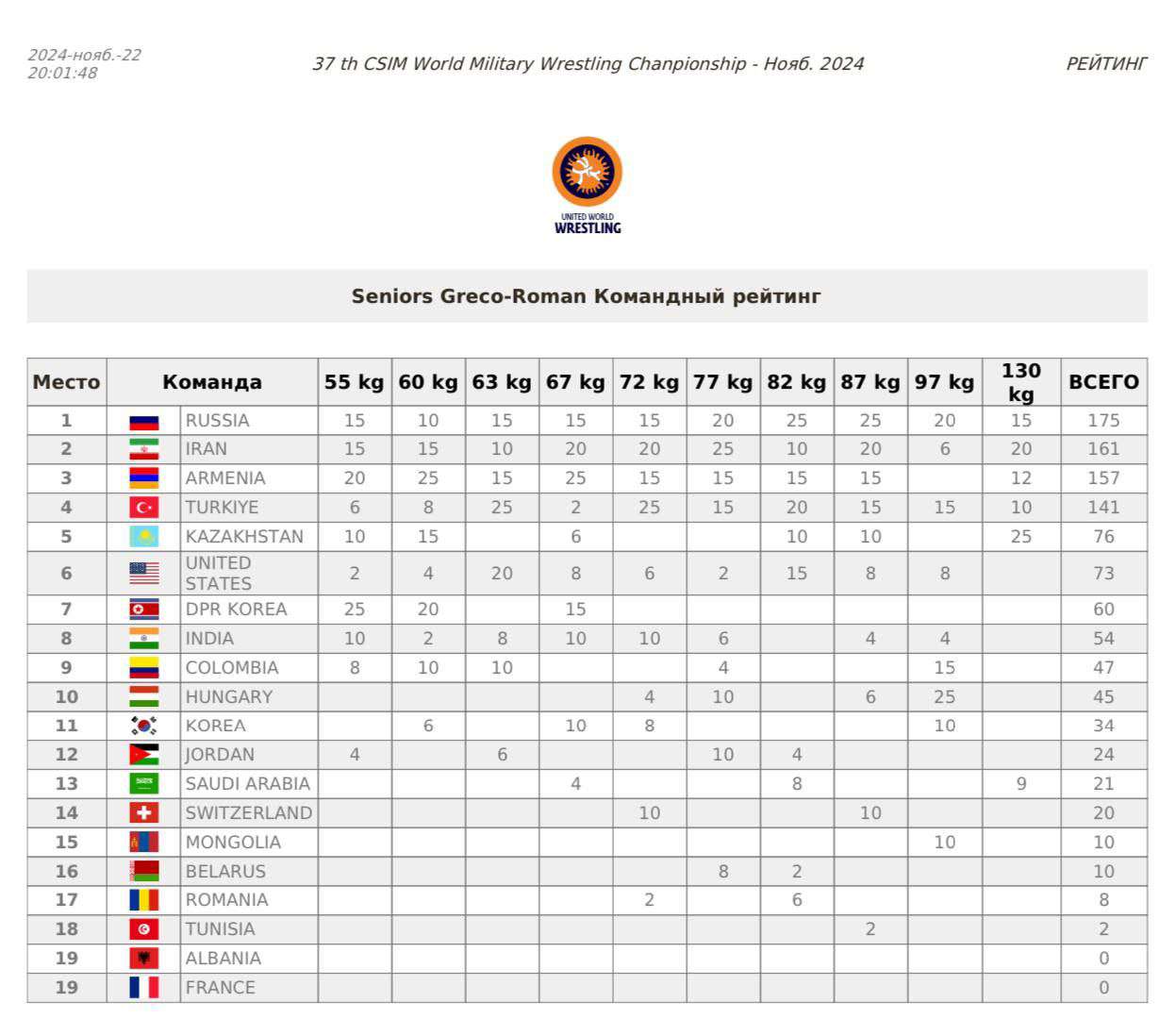Ըմբշամարտի զինվորականների աշխարհի առաջնության վերջնարդյունքում ՀՀ ԶՈւ հավաքականը թիմային աղյուսակում հունահռոմեական ոճում զբաղեցրել է 3-րդ հորիզոնականը, ազատ ոճում՝ 6-րդը: Մեր մարզիկները նվաճել են 3 ոսկե, 3 արծաթե, 8 բրոնզե մեդալ: