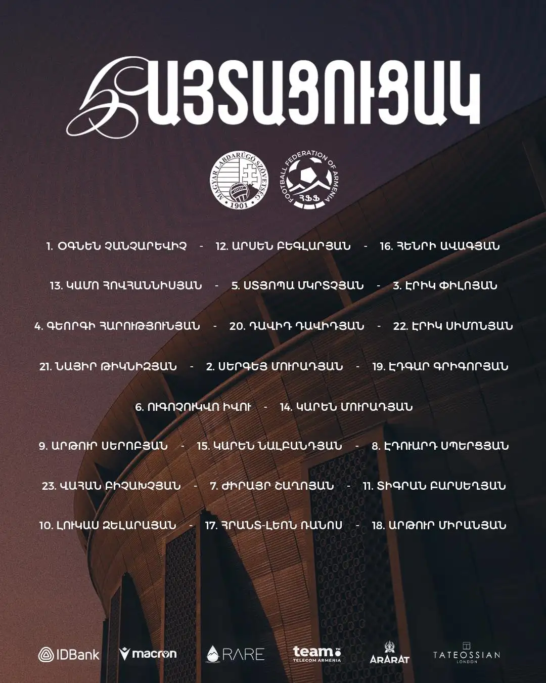 ՀՖՖ-ն ներկայացրել է Հայաստանի ազգային հավաքականի վերջնական հայտացուցակը։