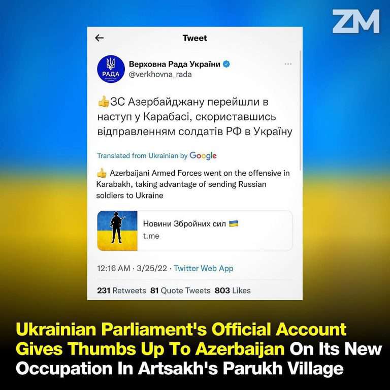 Ուկրաինայի Գերագույն Ռադան Լեռնային Ղարաբաղում Ադրբեջանի ԶՈւ սադրանքին աջակցող գրառում էր արել Twitter-ի պաշտոնական էջում։ «Ադրբեջանի զինված ուժերը հարձակման են անցել Ղարաբաղում՝ օգտվելով ռուս զինվորականներին Ուկրաինա ուղարկելուց»,- ասվում էր գրառման մեջ։