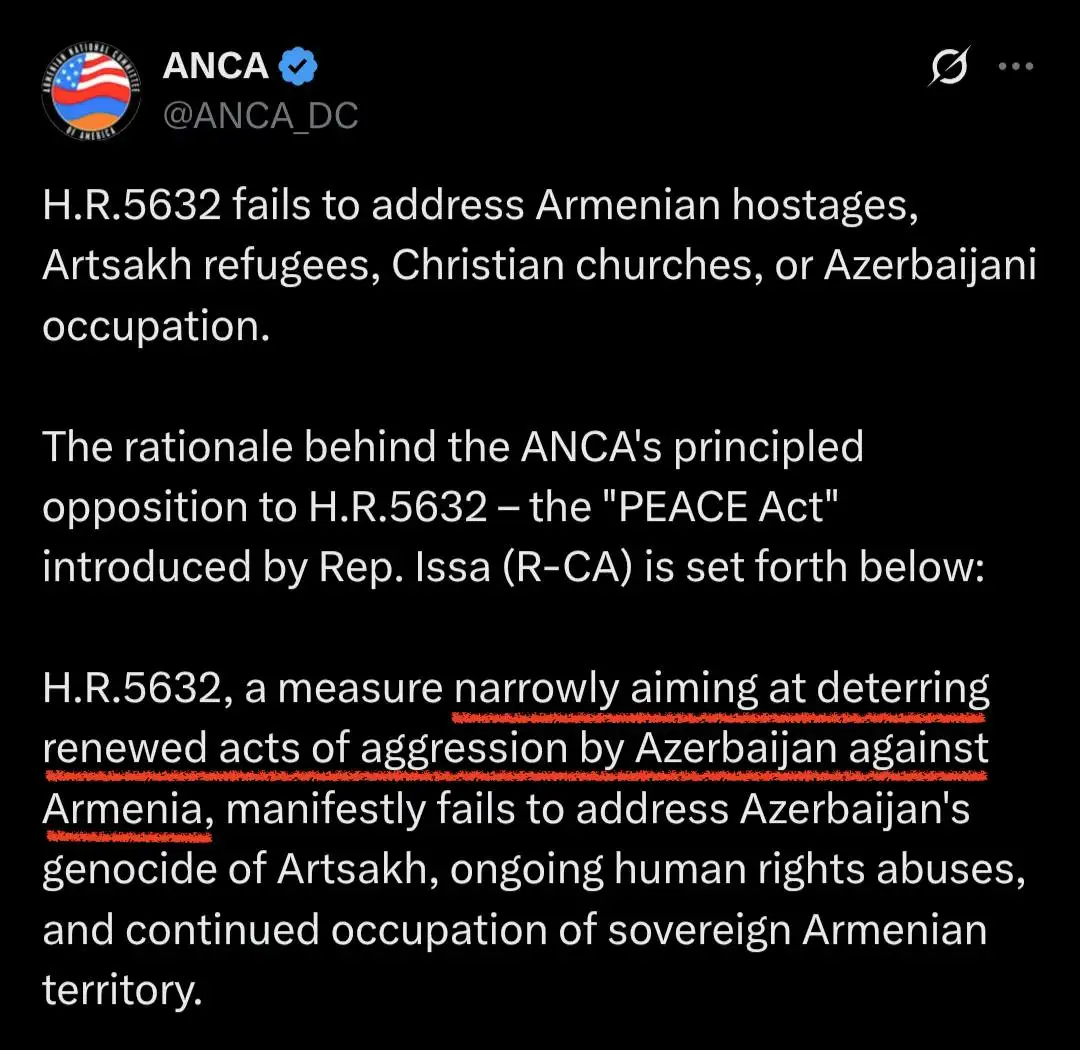 Ըստ ՀՅԴ-ի բարձրախոս հանդիսացող ANCA կազմակերպության հայտարարության` ՀՅԴ-ն դեմ է Ադրբեջանի վերնախավի դեմ պատժամիջոցներ սահմանող PEACE Act օրինագծին: Ինչու՞: Որովհետև օրինագիծը «ընդամենը» զսպում է Ադրբեջանի ագրեսիան Հայաստանի դեմ: