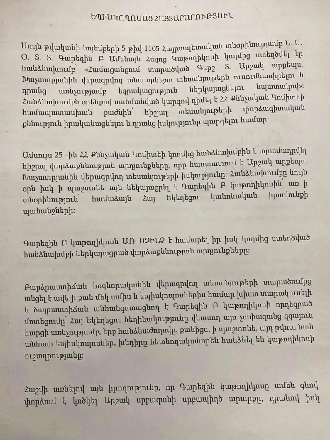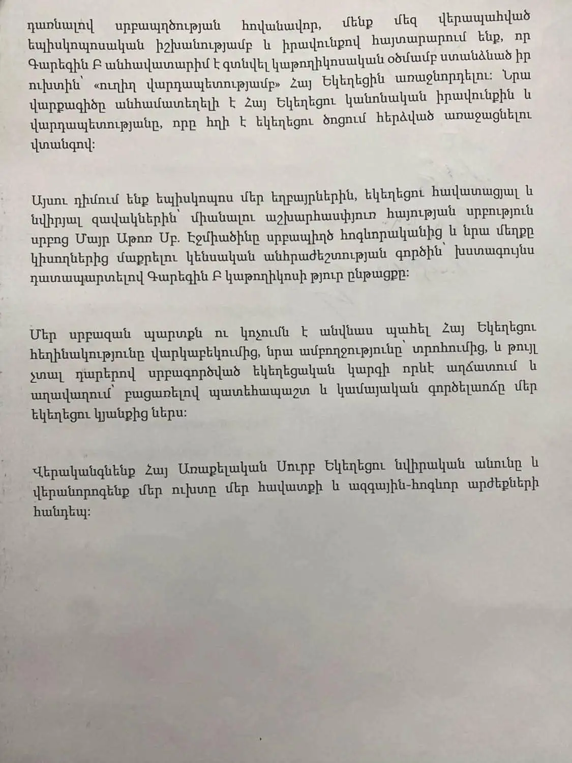 Նշենք, որ ըստ հրապարակված լուսապատճենի՝ եպիսկոպոսներն իրենց հայտարարության մեջ նշել են. «Դիմում ենք եկեղեցու հավատացյալ և նվիրյալ զավակներին՝ միանալու աշխարհասփյուռ հայության սրբություն սրբոց Մայր Աթոռ Սբ. Էջմիածինը սրբապիղծ հոգևորականից և նրա մեղքը կիսողներից մաքրելու կենսական անհրաժեշտության գործին՝ խստագույնս դատապարտելով Գարեգին Բ կաթողիկոսի թյուր ընթացքը»։