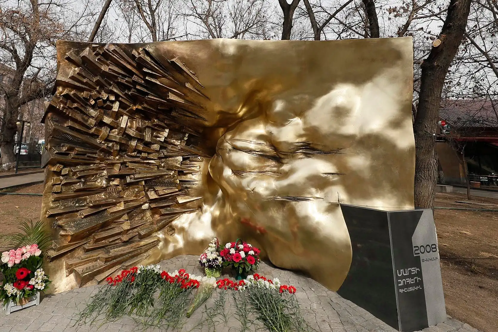 Նկարում Մարտի 1-ի զոհերին նվիրված հուշարձանն է, որը խորհրդանշում է բիրտ չարիքի հարձակումը լույսի դեմ»։