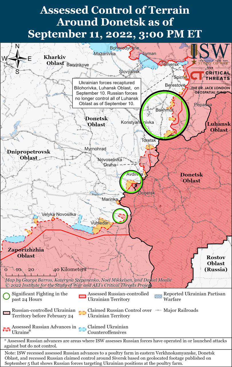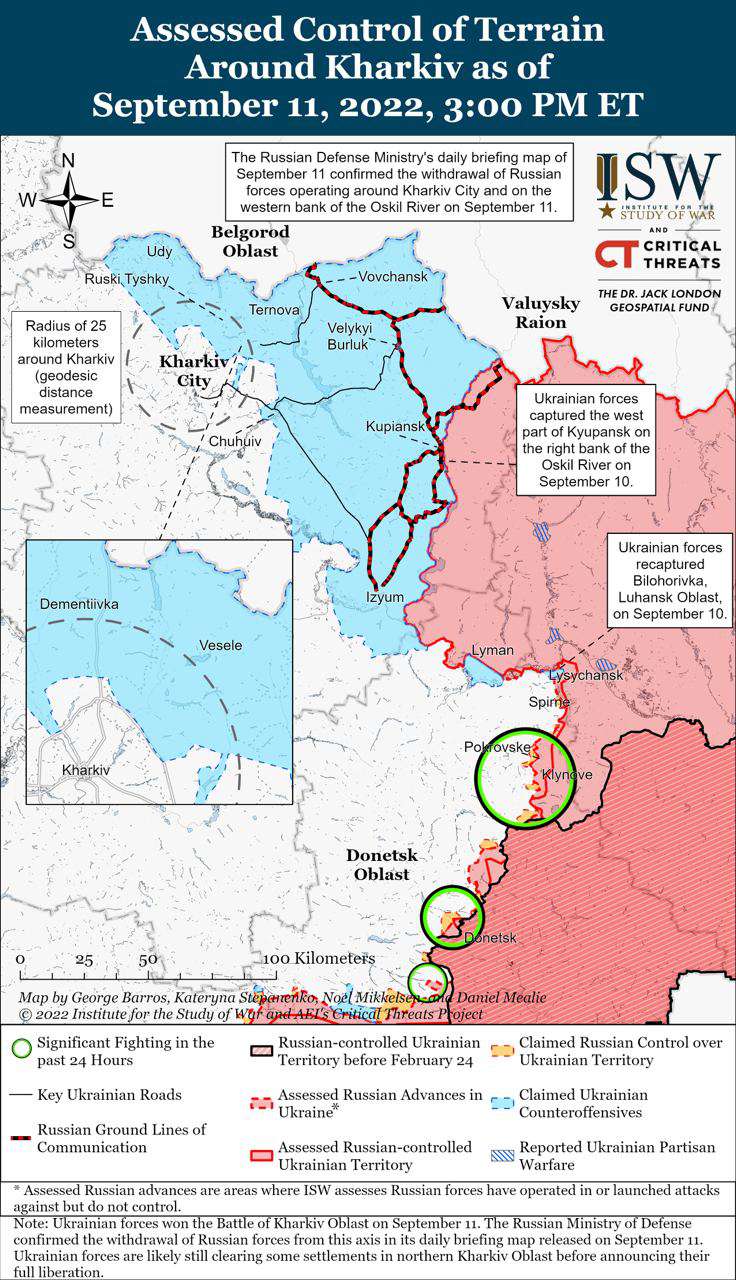 Ռուսական զորքերը գրեթե ամբողջությամբ հեռացել են Խարկովի մարզի տարածքից՝ իրենց վերահսկողության տակ պահելով Օսկոլ գետի մի փոքր մասը՝ Լուգանսկի մարզի հետ սահմանին։ Դա հետևում է վերահսկվող տարածքների քարտեզից, որը սեպտեմբերի 11-ի առավոտյան Ռուսաստանի ՊՆ կողմից ցուցադրվել է ամենօրյա ճեպազրույցի ժամանակ: