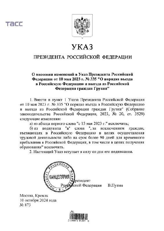 Հրամանագրի նոր խմբագրությունը, որը հրապարակվել է իրավական ակտերի պորտալում, այլևս չի պարունակում բացառություններ, որոնց համար նախկինում անհրաժեշտ էր վիզա: Մասնավորապես, այժմ առանց մուտքի արտոնագրի Վրաստանի քաղաքացիները կկարողանան ՌԴ մուտք գործել նաև աշխատանքային գործունեություն իրականացնելու նպատակով կամ ավելի քան 90 օր ժամկետով, ինչպես նաև՝ կրթություն ստանալու նպատակով։