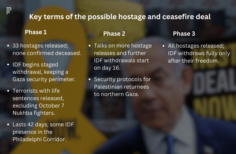 Այն կտևի 42 օր, իսկ համաձայնագրի իրականացումը կսկսվի ստորագրումից 2-3 օր հետո: Իսրայելի պաշտպանության բանակը զորքերը դուրս կբերի Նեցարիմի միջանցքից և անկլավի բոլոր բնակավայրերից՝ սահմանից մոտ 700 մետր հեռավորության վրա, բացառությամբ 5 շրջանների, որտեղ այն կգտնվի 400 մետր հեռավորության վրա: Հաղորդվում է, որ Իսրայելի պաշտպանության բանակը կկրճատի իր ներկայությունը «Ֆիլադելֆիայի միջանցքում», այնուհետև ամբողջությամբ կհեռանա դրանից առաջին 50 օրվա ընթացքում: