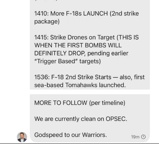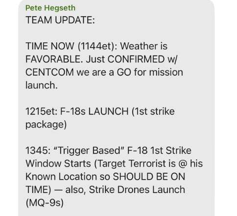 ԱՄՆ պաշտպանության նախարար Փիթ Հեգսեթի հաղորդագրությունը մարտի 15-ի առավոտյան, ամերիկյան ռազմական ինքնաթիռների օդ բարձրանալուց 31 րոպե առաջ, ներառում է մանրամասն նկարագրություն, թե կոնկրետ որ ժամին և ինչ հարձակումներ (F-18 կործանիչներ, անօդաչու թռչող սարքեր և Tomahawk հրթիռներ) պետք է իրականացվեին գործողության ընթացքում։