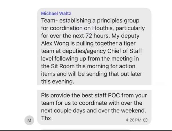 The Atlantic ամսագիրը հրապարակել է սկանդալային նոր մանրամասներ, որոնք վերաբերում են ԱՄՆ-ի բարձրաստիճան պաշտոնյաների նամակագրությանը, կապված Եմենի հուսիների դեմ ԱՄՆ-ի իրականացրած գործողությունների հետ։ Սպիտակ տան ազգային անվտանգության հարցերով խորհրդական Մայք Ուոլցի կողմից ակամայից ընդգրկվել էր ամսագրի գլխավոր խմբագիրը, ով հանրությանը բացահայտել էր չատի մանրամասները։