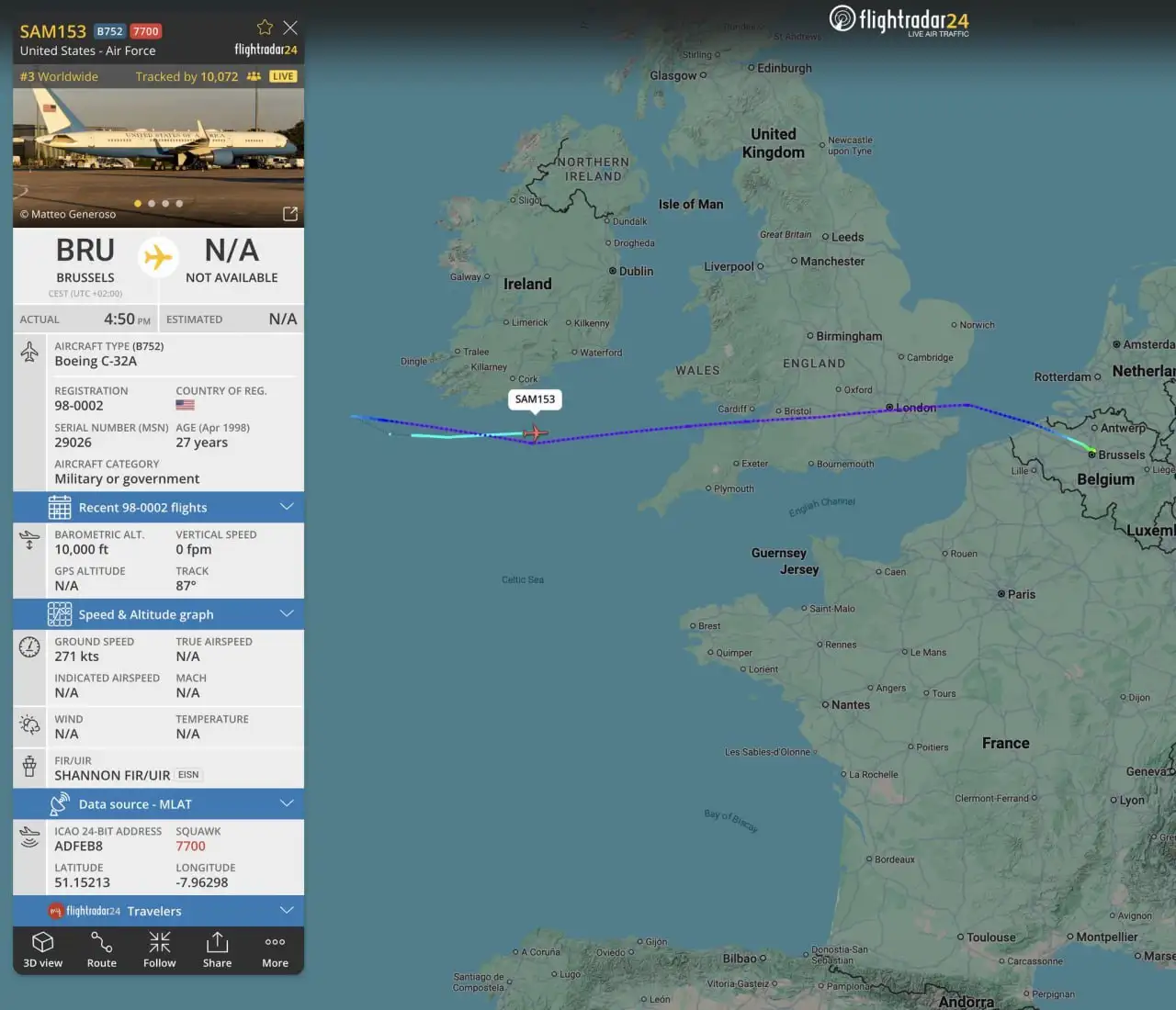 Պետական նշանակության ԱՄՆ ինքնաթիռը՝ Boeing C-32A (Boeing 757-ի ռազմական տարբերակը), որը թռիչք էր կատարում Բրյուսելից (Բելգիա) դեպի Վաշինգտոն, ստիպված է եղել վայրէջք կատարել Միացյալ Թագավորությունում։