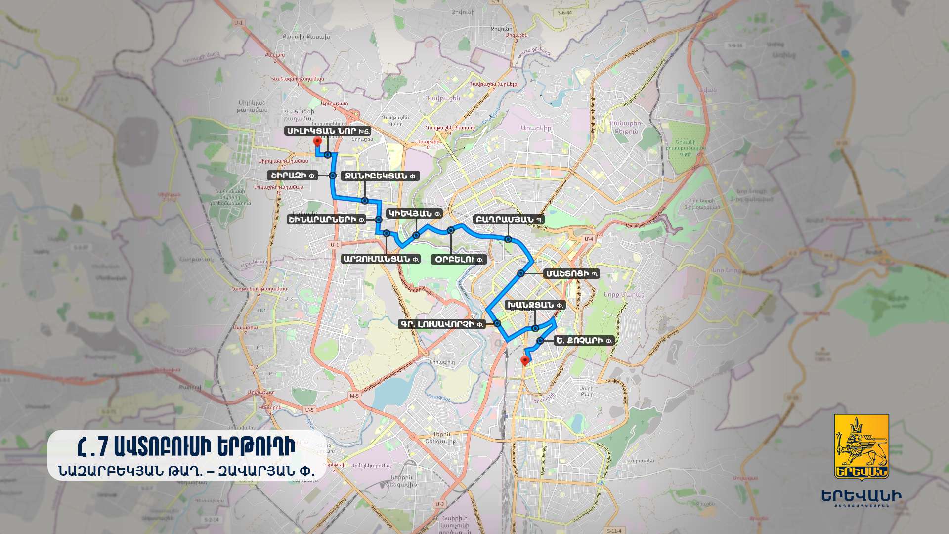 Ավան (ս.կ.) - Մարշալ Բաբաջանյան - Աճառյան փ-ներ - Մյասնիկյան պ. - Աբովյան պուր. -Աբովյան - Կորյունի - Նալբանդյան - Խանջյան փ-ներ - Տ.Մեծի - Արցախի պ-ներ - Էրեբունու - Այվազովսկու - Տիտոգրադյան - Խաղաղ Դոնի փ-ներ - Էրեբունու զ/ծ (վ.կ): Հետադարձը` նույնը մինչև Խանջյան - Մոսկովյան - Աբովյան փ-ներ - Մյասնիկյան պ.-շարունակությունը՝ նույն ուղեգծով: Շարժակազմի քանակը՝ 14 միավոր: