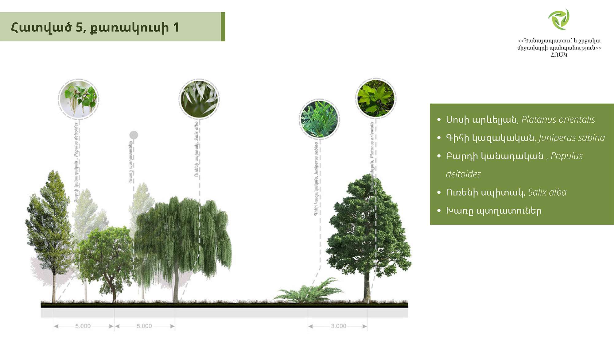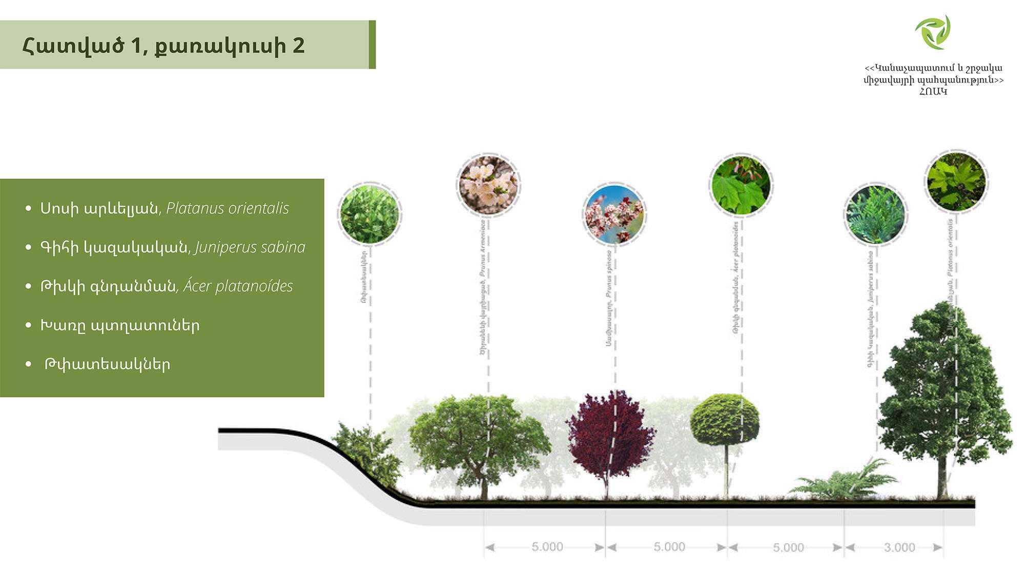 Հաշվի առնելով յուրաքանչյուր հատվածի առանձնահատկությունը՝ ընտրվել է համապատասխան ծառատեսակային կազմ։