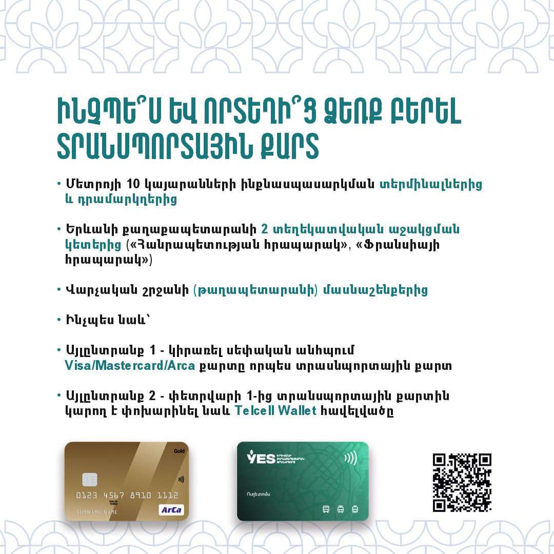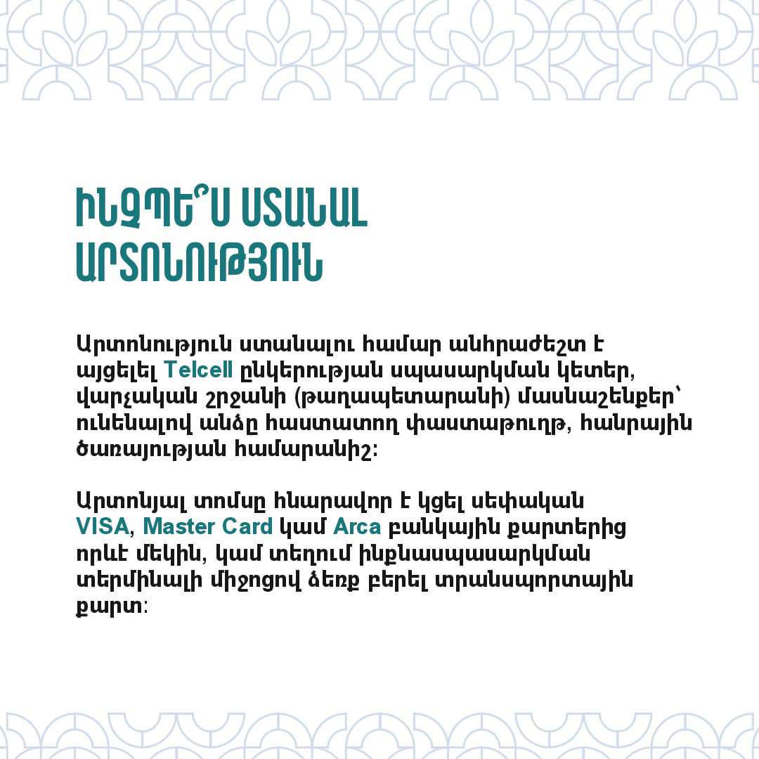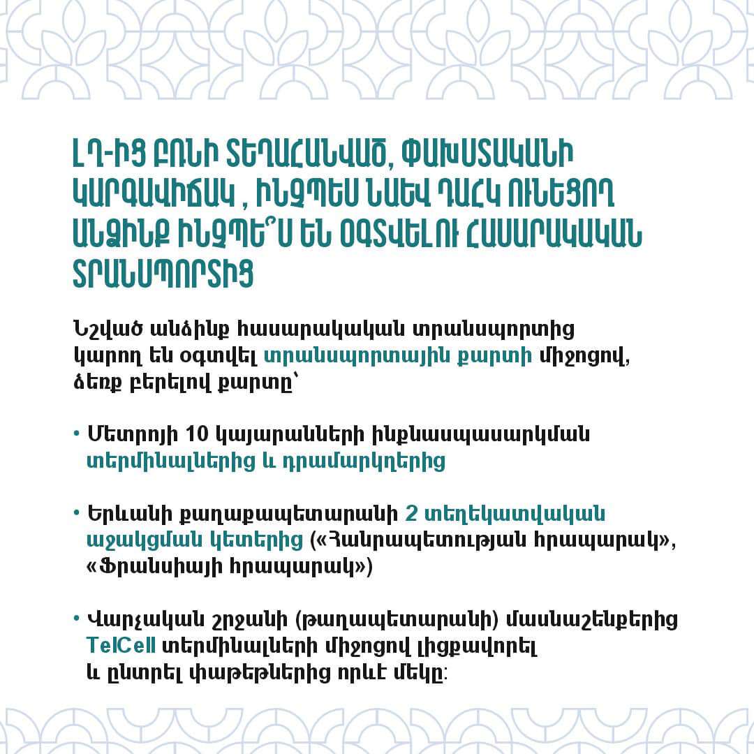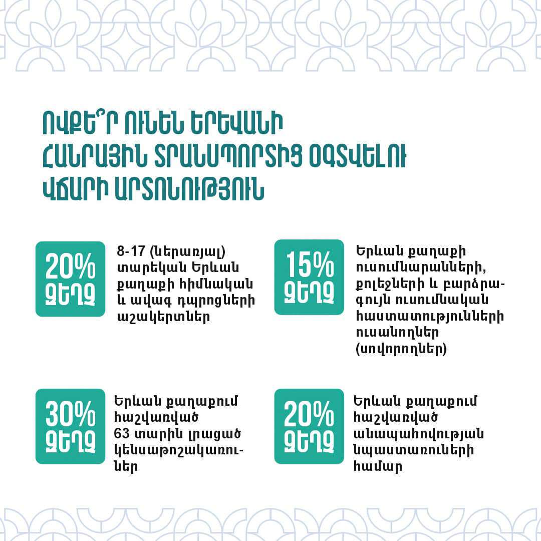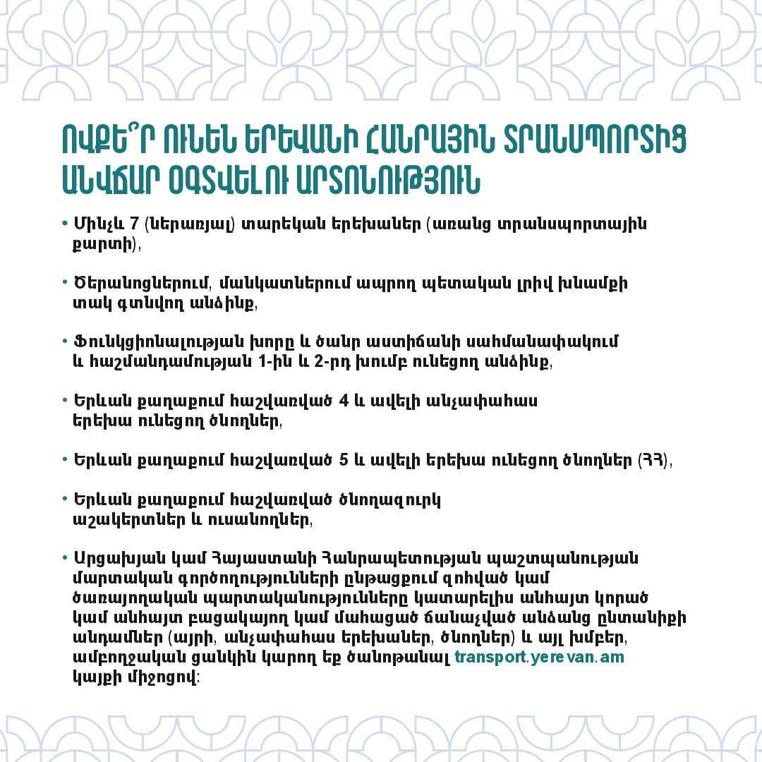 Երևանի քաղաքապետարանը տեղեկացնում է, թե ովքե՞ր ունեն Երևանի հանրային տրանսպորտից օգտվելու վճարի արտոնություն, ովքե՞ր ունեն Երևանի հանրային տրանսպորտից անվճար օգտվելու հնարավորություն, ինչպե՞ս ստանալ արտոնություն, ինչպե՞ս և որտեղի՞ց ձեռք բերել տրանսպորտային քարտ, ԼՂ-ից բռնի տեղահանված, փախստականի կարգավիճակ, ինչպես նաև ԴԱՀԿ ունեցող անձինք ինչպե՞ս են օգտվելու հասարակական տրանսպորտից։